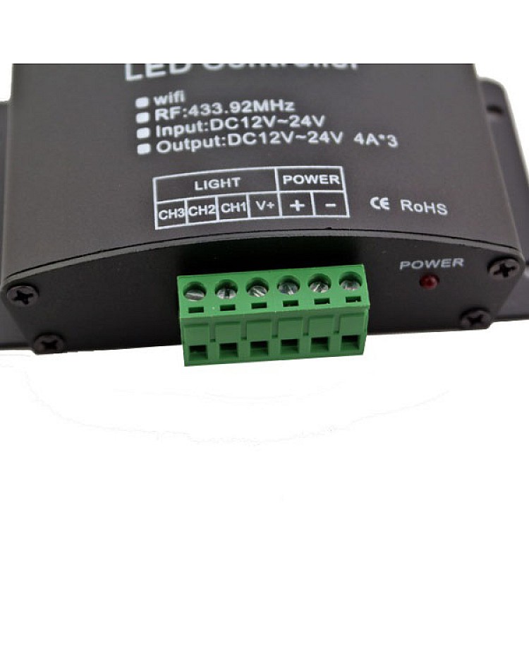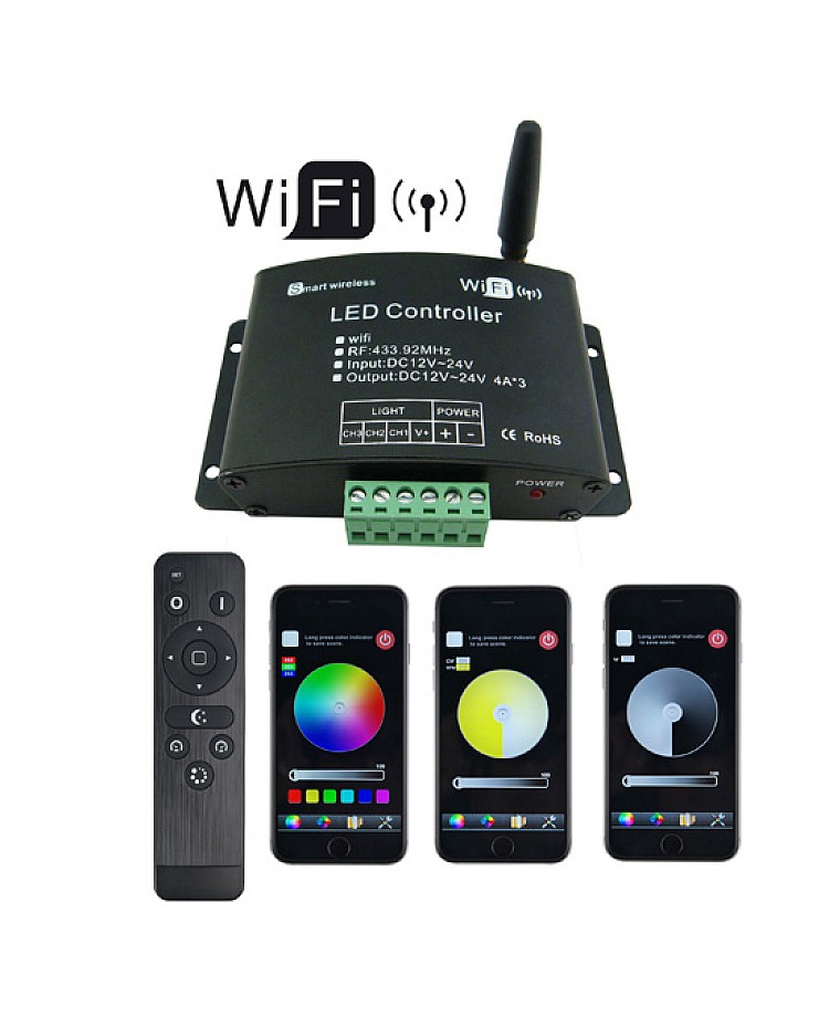 The LED WiFi controller has a 3-in-1(DIM, CCT, RGB) function, with the installation of controlling software on mobile devices with Android or IOS systems, such as smartphones, iPhones, tablets, etc. You can remotely control the LED lights through WiFi. Make the LED control more intelligent and humanized. The 2.4G LED WiFi controller has a 3-output-channel design, the max output current of each channel is 4A, and the max loading power is up to 288W when working in DC24V. With 3 in 1 function, you can use it as a dimmer, RGB controller, or CCT controller to control the various LED lights; you only need to select the right control interface in the software. The WiFi LED controller comes with a 2.4G RF remote control, which you can use to control the LED light easily. You can use it to turn on/off, change the dynamic modes, and adjust the brightness or speed of the dynamic mode.