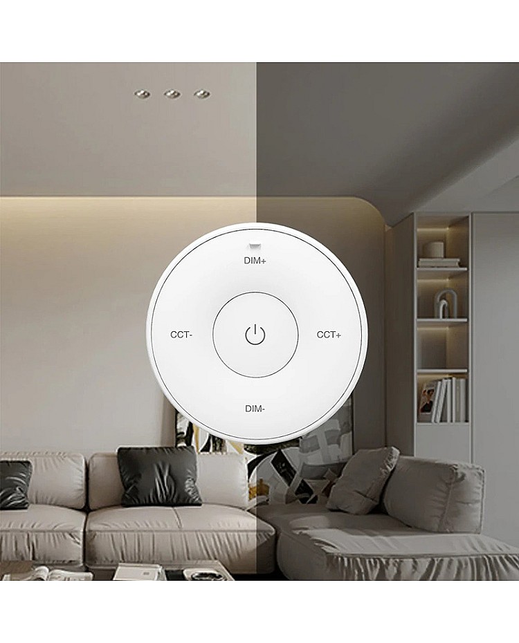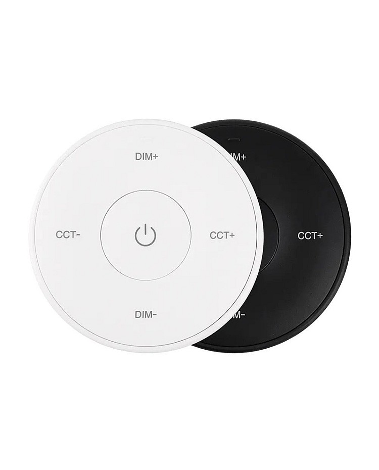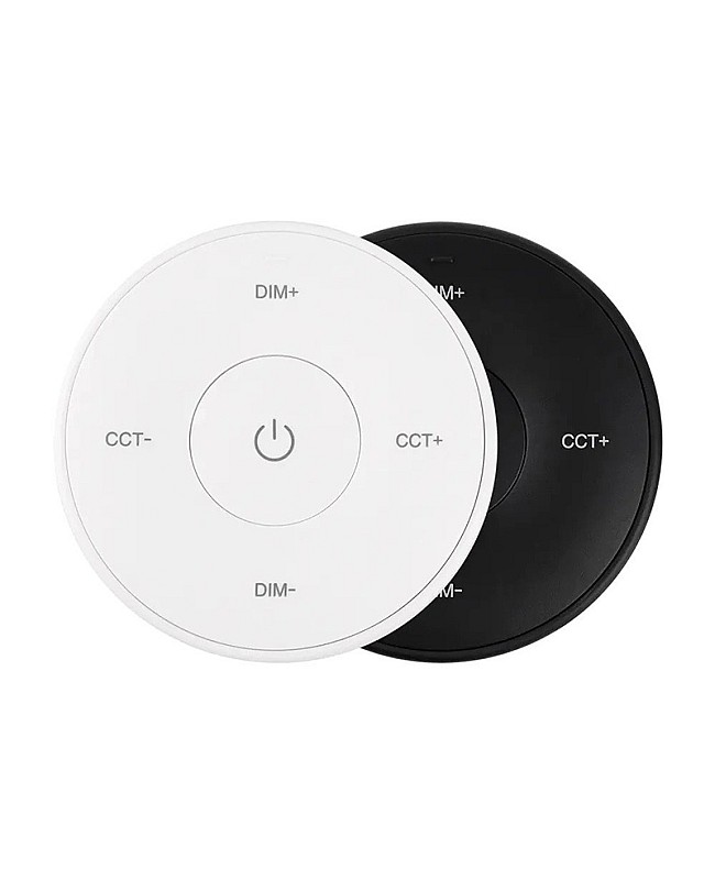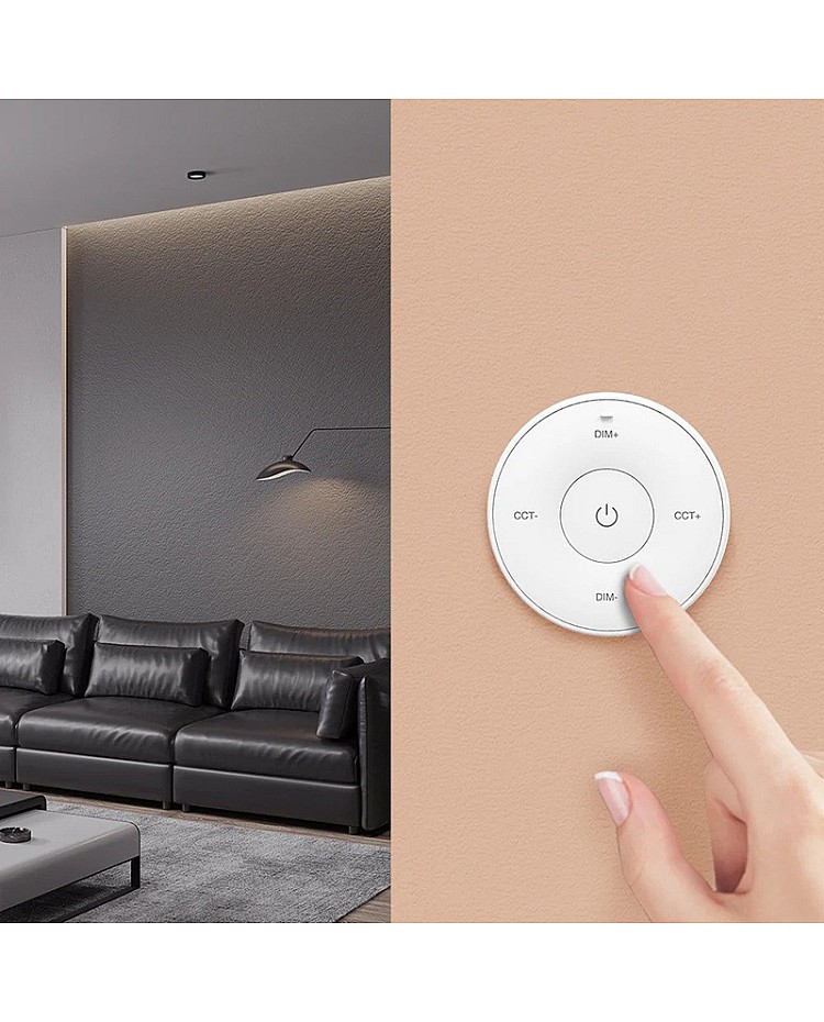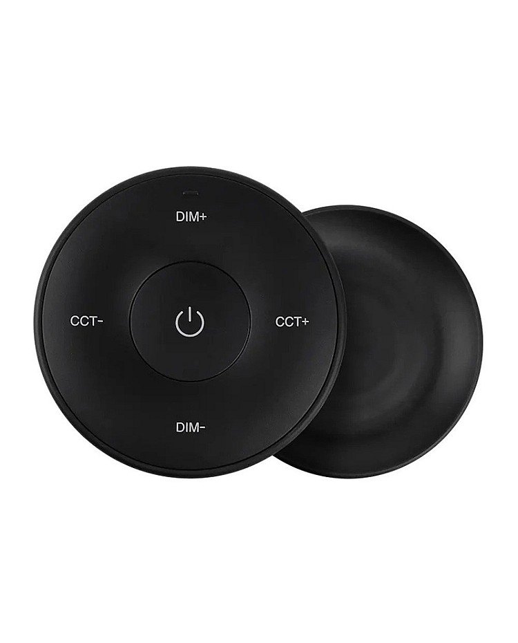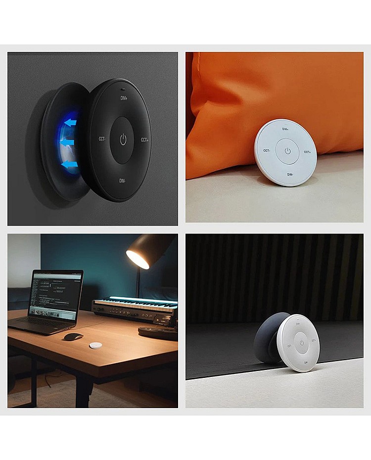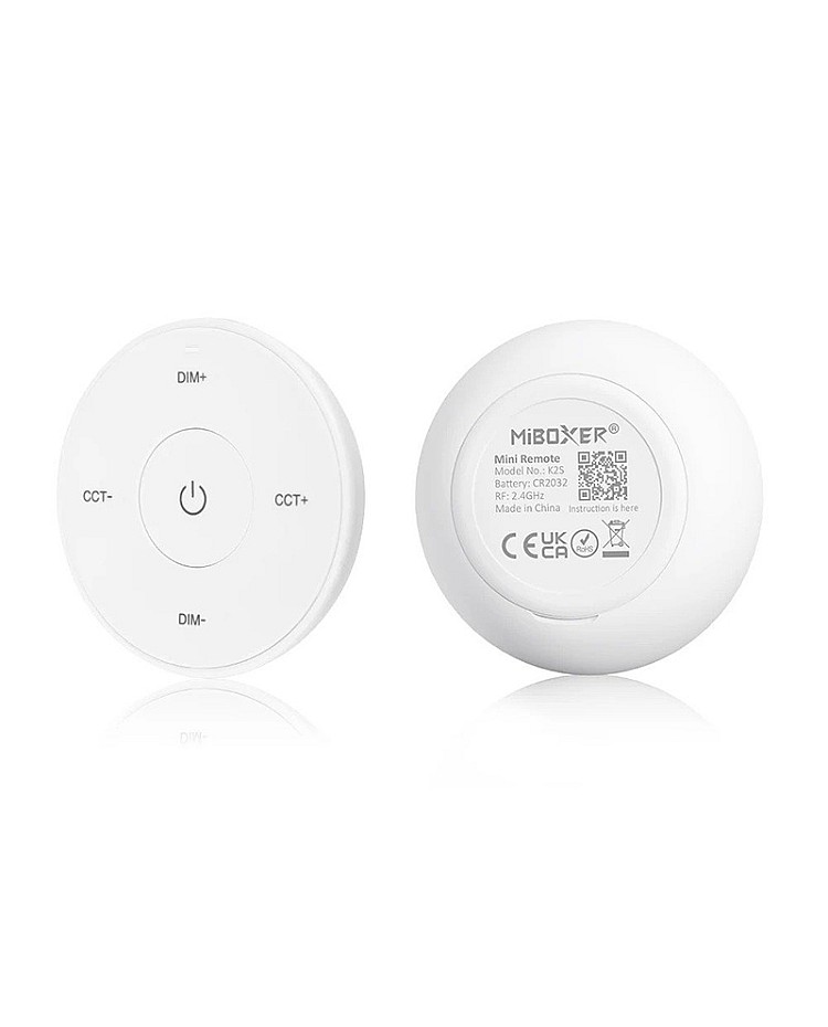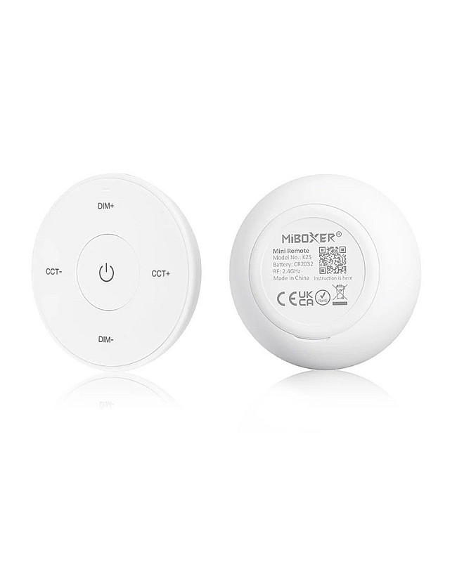 The MiBoxer K2S mini remote is round. It uses 2.4 GHz RF wireless technology, allowing it to pair with MiBoxer and MiLight single-color or CCT LED lights and controllers to adjust brightness and color temperature for various scenes. There are intuitive buttons on the remote control; you can use them to turn ON/OFF and increase or decrease brightness or color temperature. A magnetic connection between the holder and the strip light remote control makes putting back or taking off easy. A single-cell battery powers the K2S replacement remote, and it can be easily replaced. Black and white colors are available.
