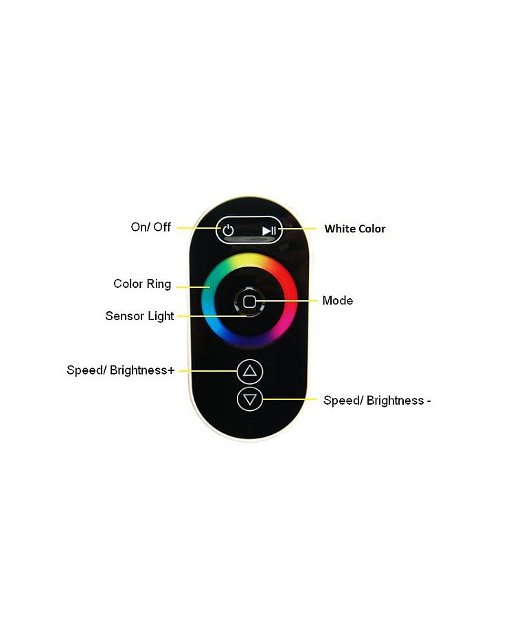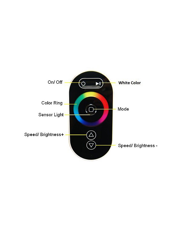 - RF Touch Remote Control With 5 Functions, 1 Color Ring, And 1 Color Sense Lamp In The Center Included
