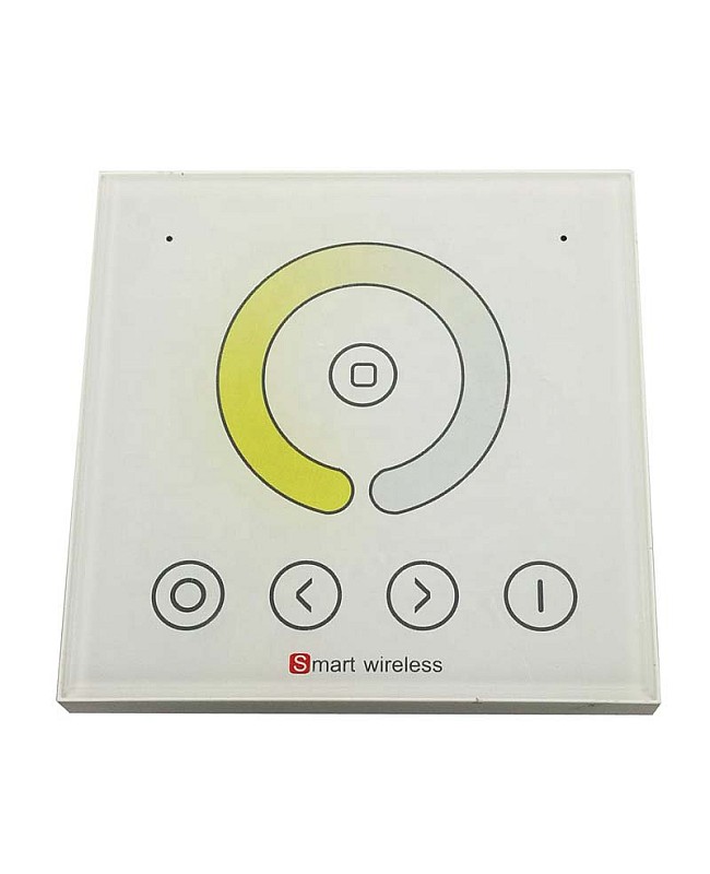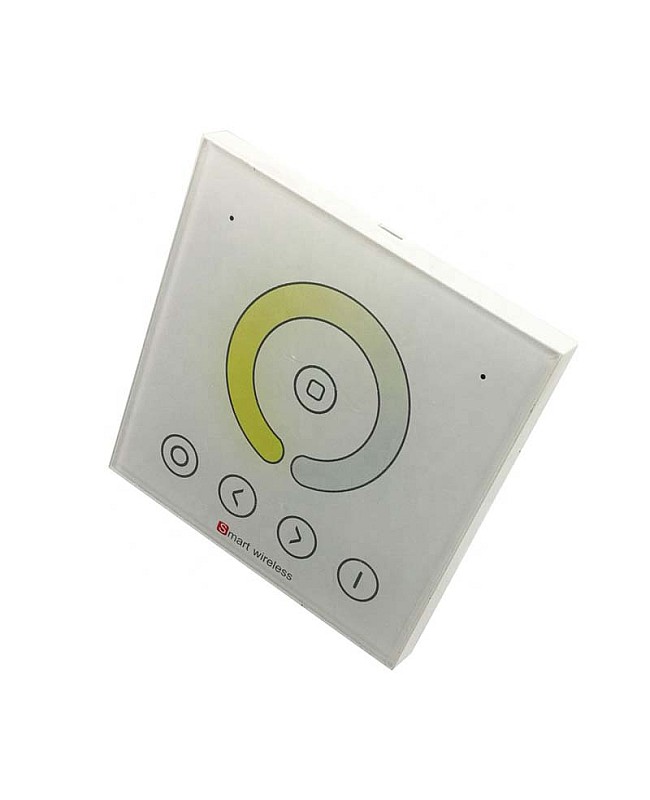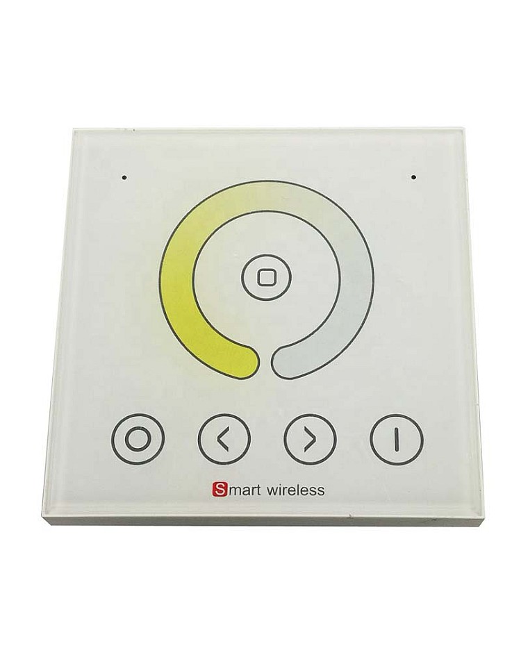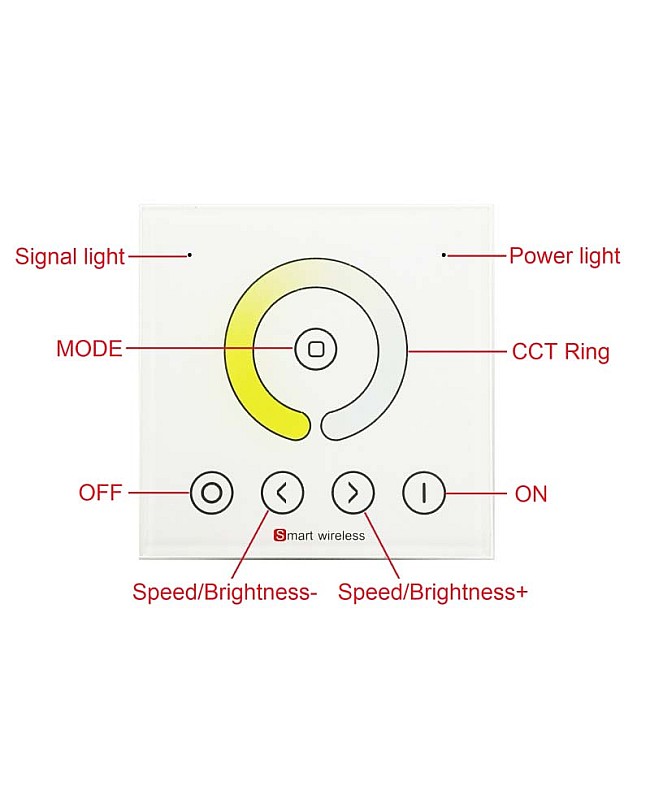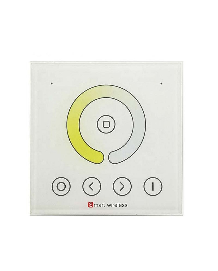 The RF wall panel CCT LED controllers work on DC12V or DC24V and are designed for constant working voltage LED lights. The CCT LED controller has a 2-output-channel design, with a max output current of 4A and a max output power of up to 192W. Adopts the capacitive touch-sensitive design, unique appearance, and easy operation. With memory function, each time it powers on, it resumes the mode that was stopped in the last power-down. The dimension is according to the 86-type European standards. The wall panel controller has 5 buttons and 1 CCT control ring. You can set the working mode, with 9 working modes, and control the speed for dynamic or brightness for static color. The CCT color ring can control the color temperature you want.