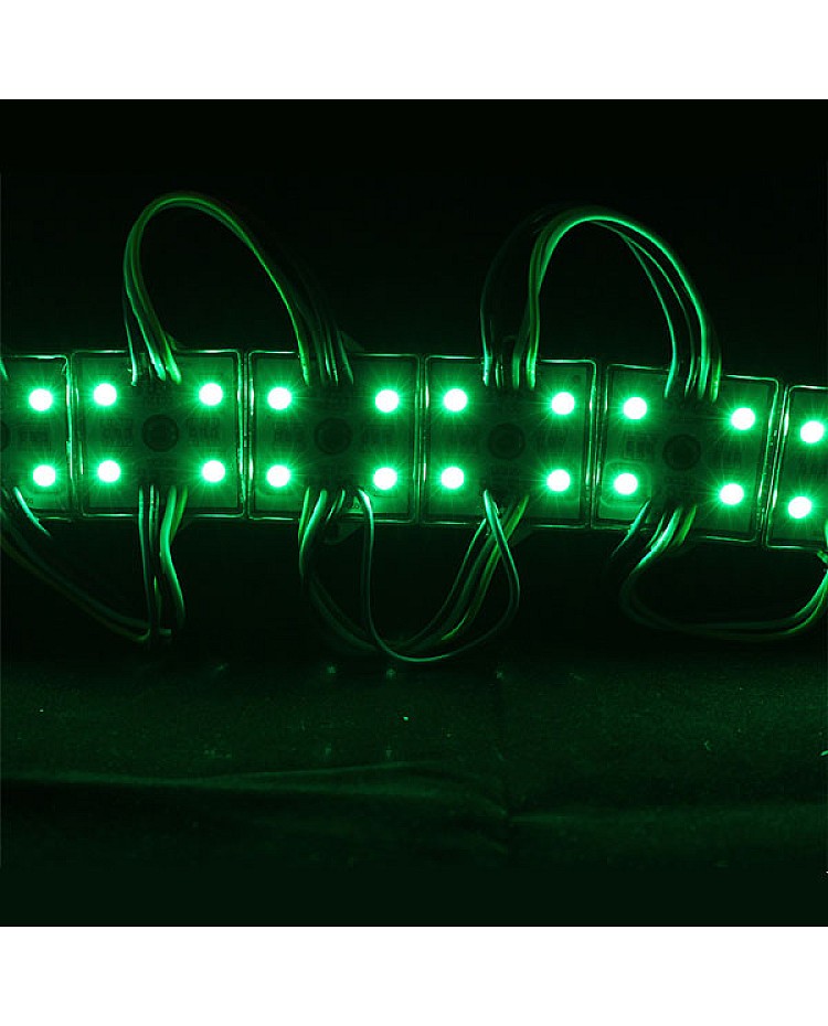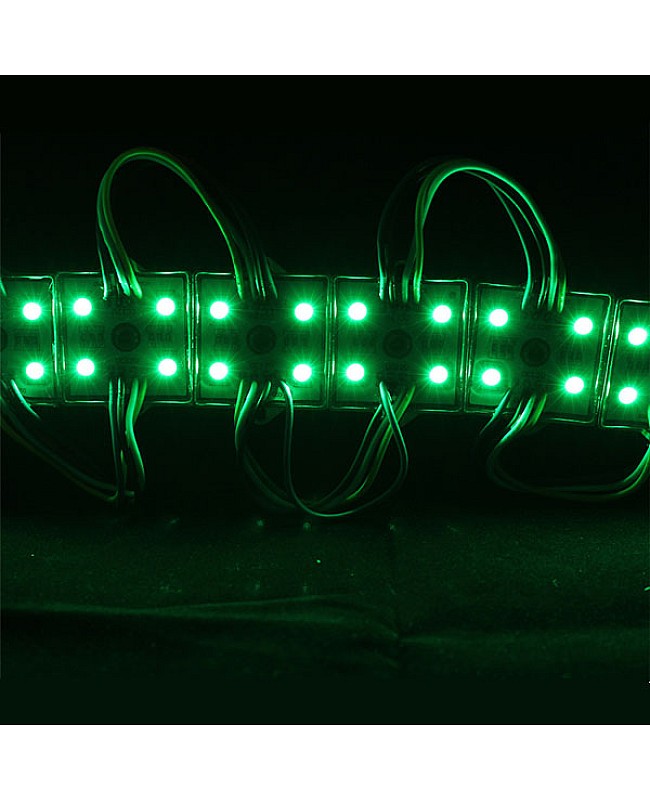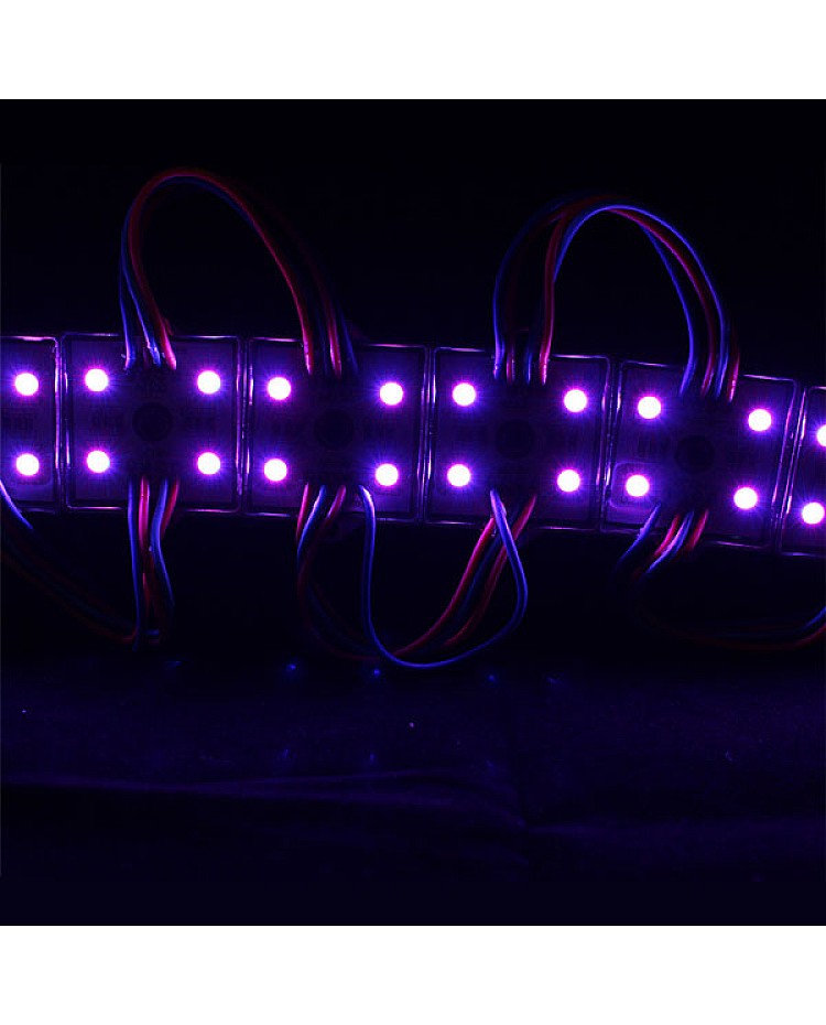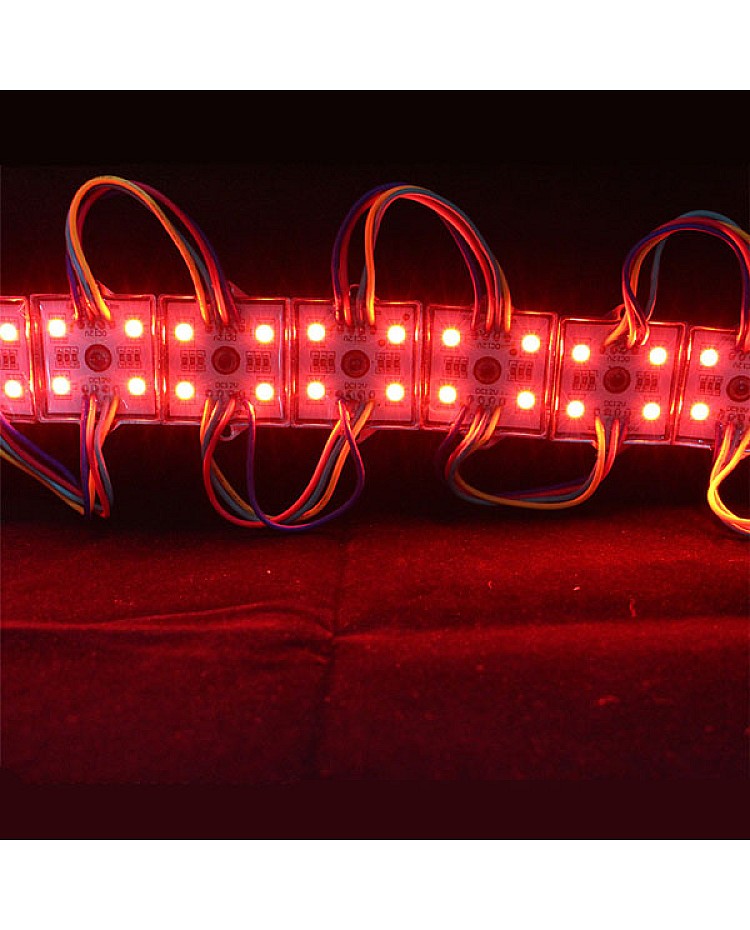 The RGB 5050 LED modules with metal shell, which uses the 4PCS 5050 SMD LEDs as the light source, the LEDs mounted on the aluminum board and in the metal shell for the better heat dissipation, the surface with epoxy sealed, the IP rating is IP65, can be used for indoor and outdoor applications. The RGB 5050 LED modules are 20 pieces per string, cuttable and reconnectable, and you can cut to any quantity for your project and reconnect them. The RGB LED modules work in DC12V and are easy to connect to the LED Driver and RGB Controller to light up or adjust the static colors or the dynamic modes. The back has double-sided adhesive tape, so take off the protector on the tape and stick it to the place you want to install it. The center of the metal shell with the screw hole, you also can use the crews to fix them on the surface of your lighting projects. The RGB LED light modules are widely used for holiday decorations, backlights for channel letters, signs, billboards, etc.