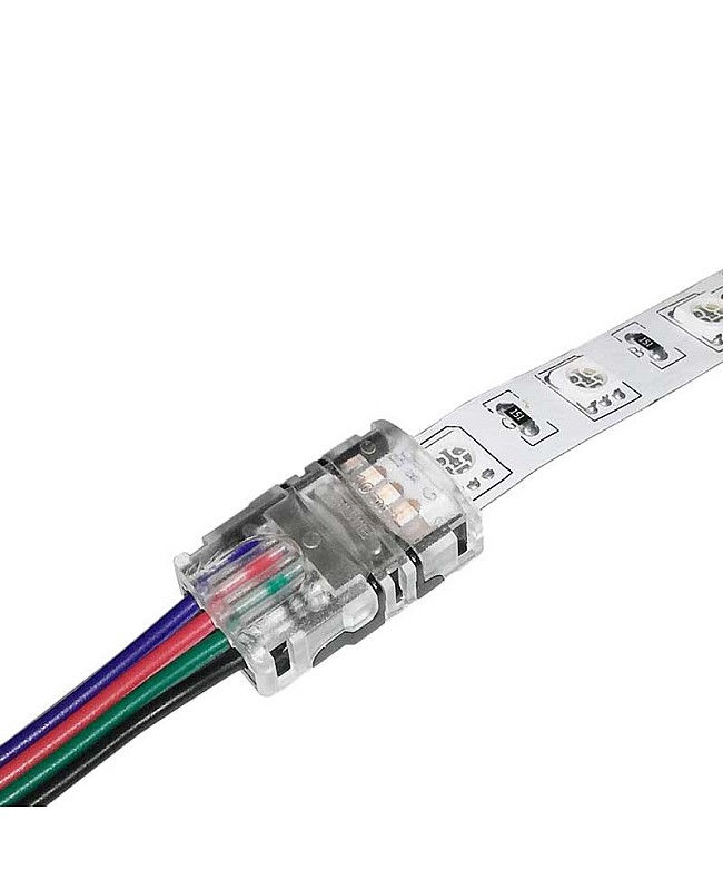 The IP65 waterproof RGB LED connectors for weatherproof RGB LED strips, both sides with the Solderless 4 Pin connectors, can work with the IP65 epoxy-coated RGB LED strips directly, only insert the LED strips into the connector and clip on the connectors, easy to install and use. You can connect 2PCS IP65 RGB LED strips easily without any tools.