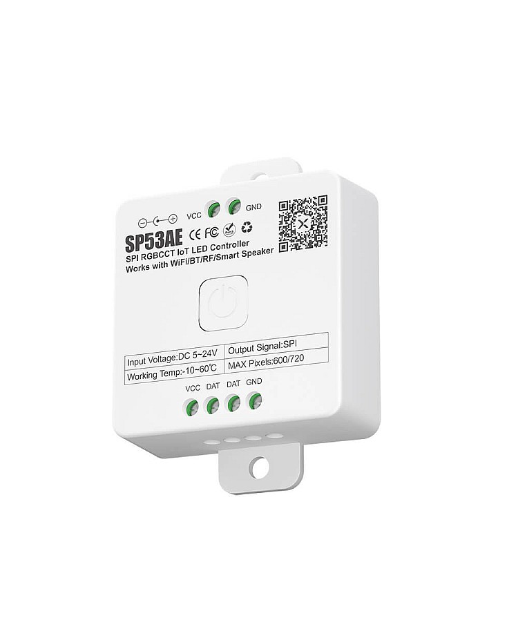 The SP53AE is an SPI RGBCC LED controller that controls five-channel or six-channel single-wire driving ICs through SPI signals. They will deliver smart lighting control with seamless integration across APP, voice, and multi-zone management. They are designed for SPI RGB+CCT SMD or COB strip lights, allowing you to customize brightness, colors, and color temperature with precision. Bluetooth, WiFi, local area network, and remote cloud connection are available via mobile app, and can also be controlled by 2.4G RF remote controls. Through the mobile app, you can access millions of colors, preset modes, dynamic effects, and scheduled lighting. It also supports voice assistants like Amazon Alexa and Google Home, enabling hands-free operation. It supports three music signal input methods: mobile phone mic, player streaming, and onboard mic. Under the music modes, the lighting will change automatically following the music beats.