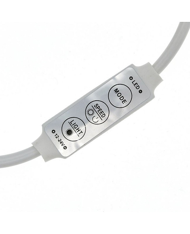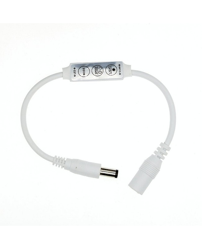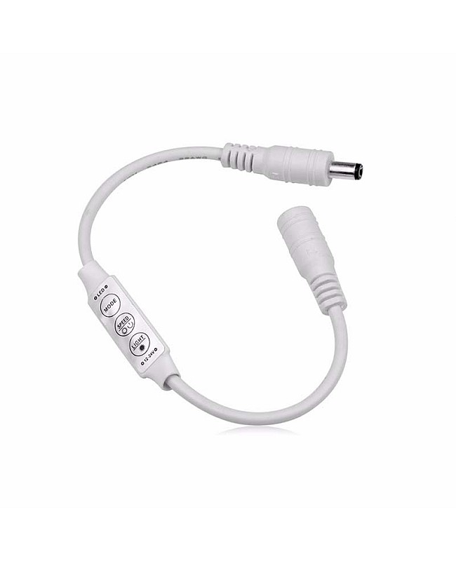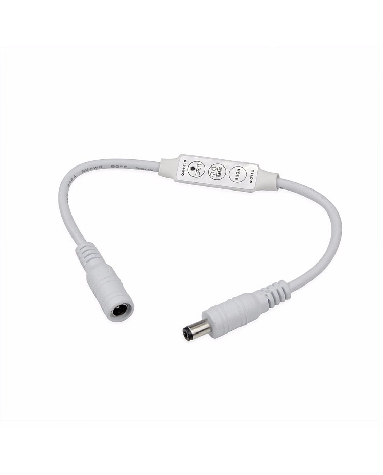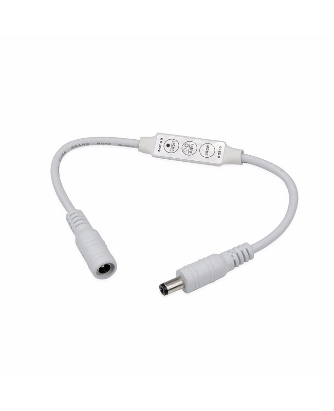 With a one-output-channel design, the LED mini dimmer with male and female DC connectors works with single-color LED strips. The max output current is 6A, which can work in DC12V or DC24V. In DC12V, the max output is 72W; in DC24V, the max output is 144W. The Inline LED dimmer has 3 buttons: mode, light, and speed buttons, 10 levels of brightness adjustable for static colors, and 10 speeds adjustable for 8 dynamic modes. The single-color mini LED dimmer is small in size and compact in structure, making it ideal for use in narrow spaces. It comes with female and male DC Connectors, making connecting to the LED power supply and strips easy.