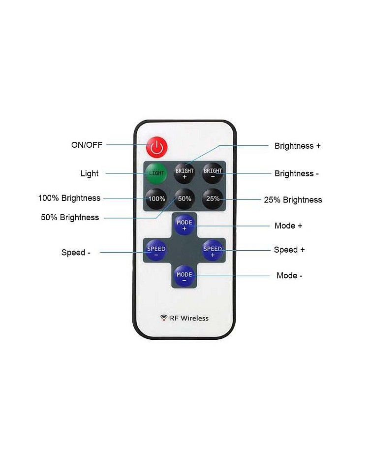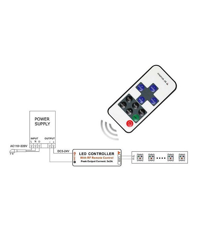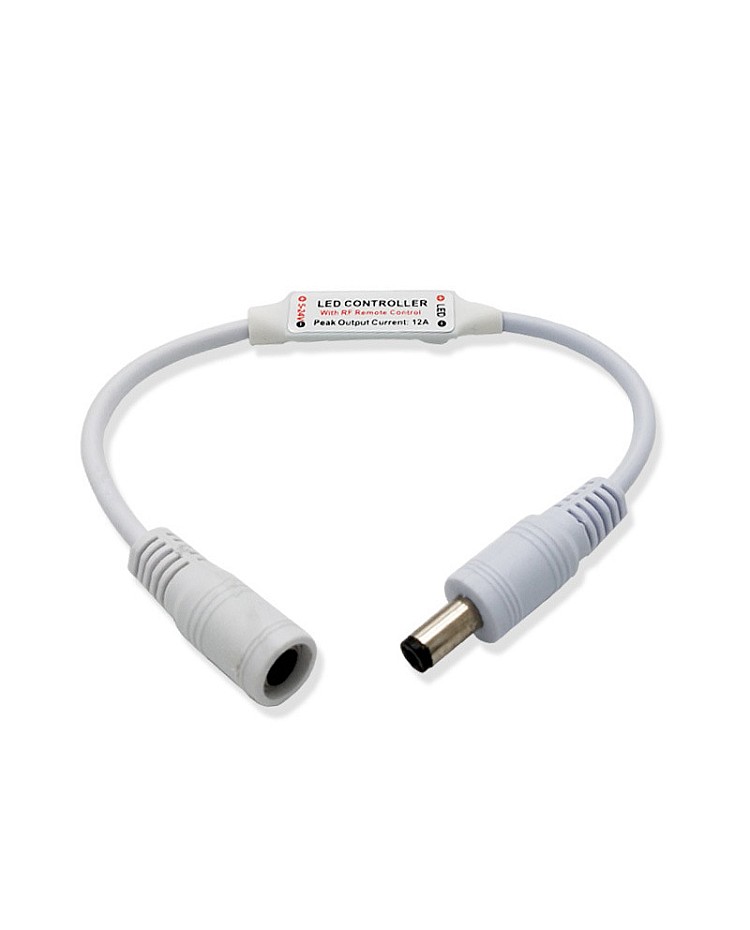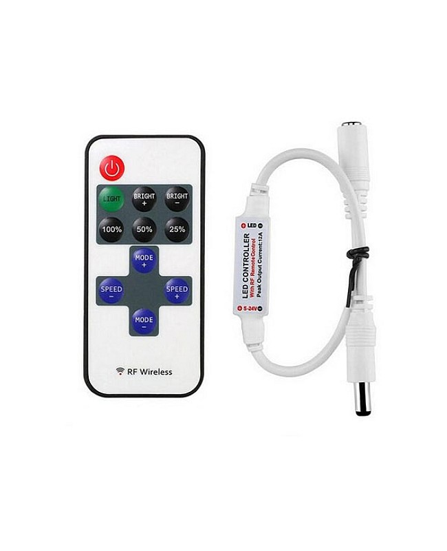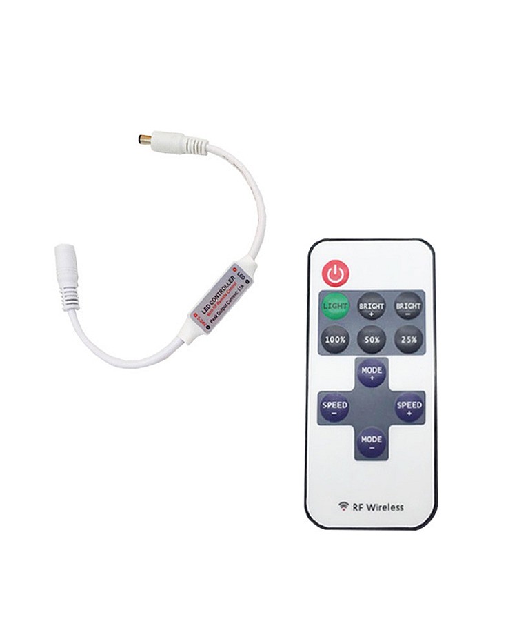 The single-color LED strip controller has a mini size and compact structure, which makes it suitable for use in a narrow space. The single color LED controller works on DC5V to DC24V, designed for the constant voltage single color LED lights, LED point source lights, LED strip lights, wall wash lights, etc., with one output channel design, the max output current is 6A, max loading power is 144W when working in DC24V. The 11-key RF remote control includes features that allow you to turn on/off the LED light, adjust the brightness of static colors, or adjust the speed of dynamic modes. The mini LED strip controllers with male and female DC connectors allow connecting to the LED transformer and single-color LED strips to light them up easily.