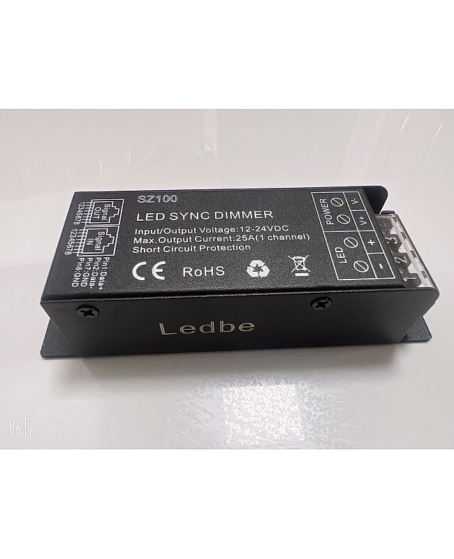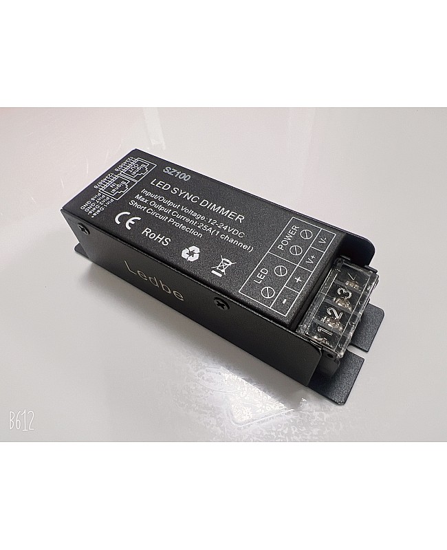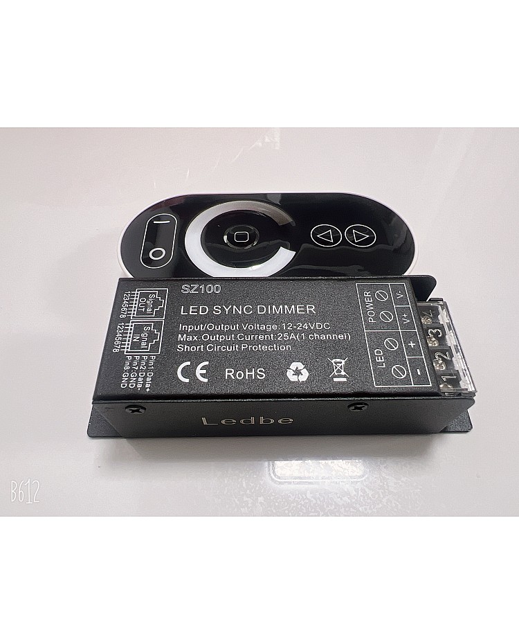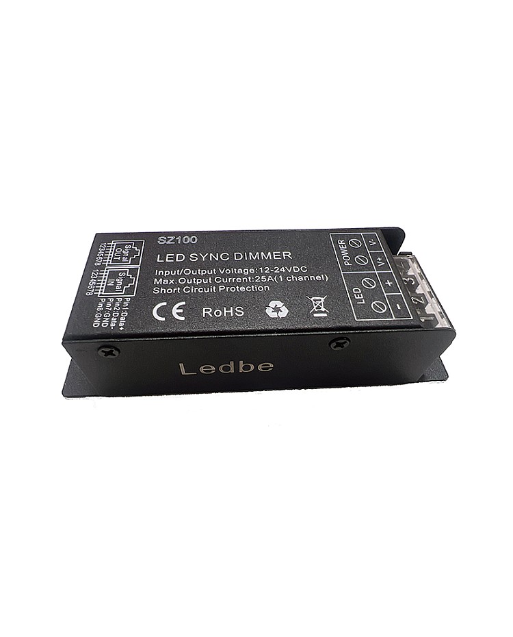 The sync RF LED dimmers are high-power, wireless dimming controllers designed for precise and smooth brightness adjustment of single-color LED lights. They employ the most advanced PWM (pulse width modulation) digital dimming technology, along with a touch-sensitive remote, which provides reliable long-range control and synchronized dimming. The SZ100 light dimmers have dual RJ45 ports for the synchronization function. You can connect multiple LED dimmers together via the RJ45 ports and achieve the synchronization function of LED strip lights. With a maximum output of 600W at 24V, the SZ100 is ideal for large-scale LED installations or architectural projects. The memory function retains the last setting even after the device is powered off, ensuring consistent performance. The RF full-touch remote control features a user-friendly touch wheel and buttons for quick brightness adjustment and mode setting. The metal shell of the SZ100 can work as a heat sink for better heat dissipation.
