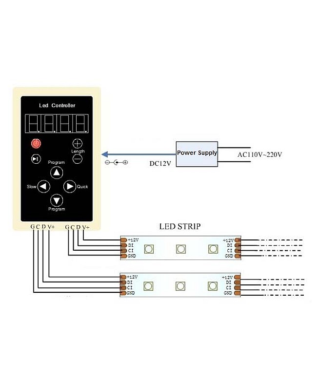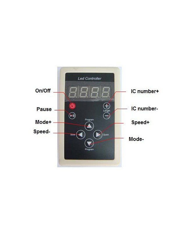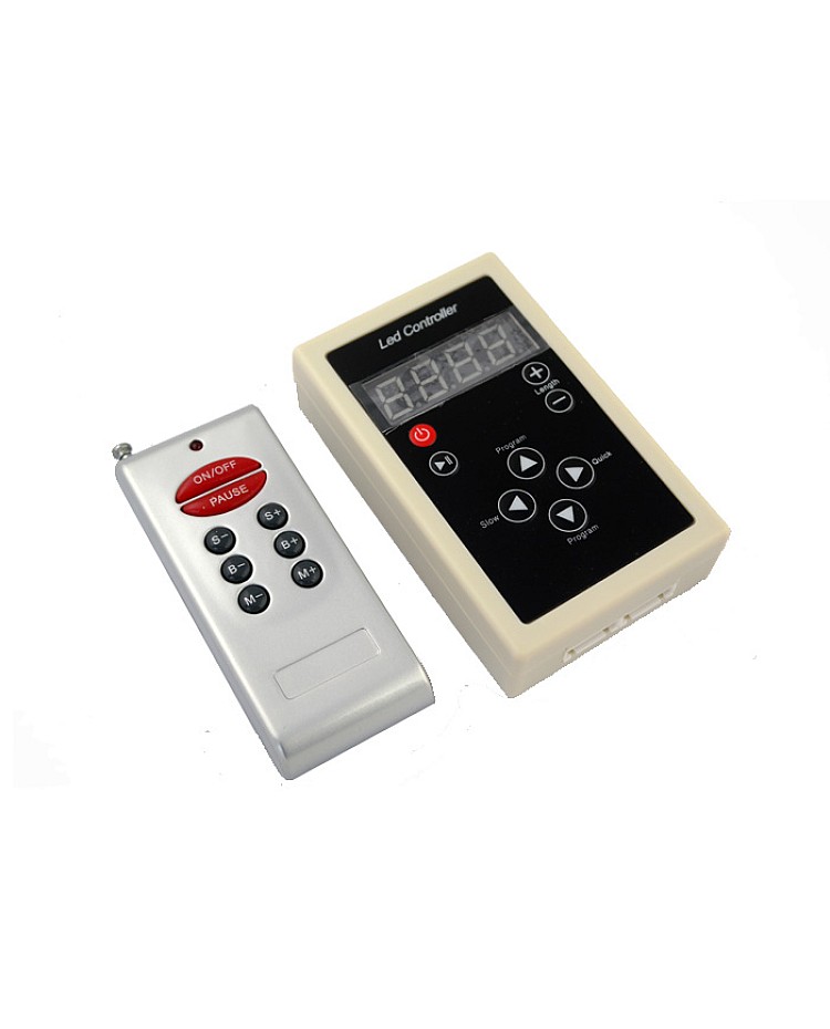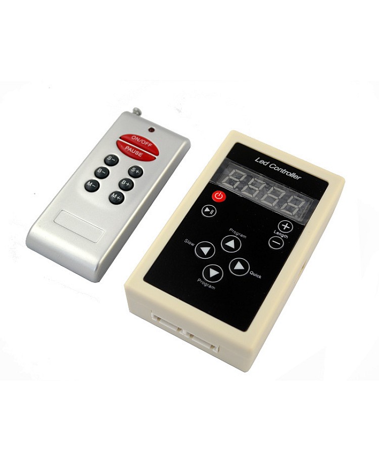 The addressable LED controllers are designed for products that use the LPD series, UCS series, TM series, and WS series (LPD6803/UCS1903/TM1804/TM1809/TM1812/WS2811/WS2801) ICs as the driver, which is very useful for lightbox advertisements, stage lights, house decorations, etc. The constant voltage digital LED controller operates between DC 12V and DC 24V, with a memory function; each time it powers on, it retains the mode it was stopped in at the last power-off. Digital LED strip controller with eight physical keys, allowing you to turn the LED light on or off, adjust the controlled IC numbers, switch between working modes, and adjust the speed of lighting effects. The eight-key RF remote control is included. You can use it to turn on/off, select the dynamic lighting pattern, or adjust the brightness or color-changing speed. There are 133 modes in total; the 132nd mode is the auto-cycle, which runs from 1st to 131st, and the 133rd mode is the DIY mode. With two groups of SPI signal output, each group drives at most 2048 pixels.