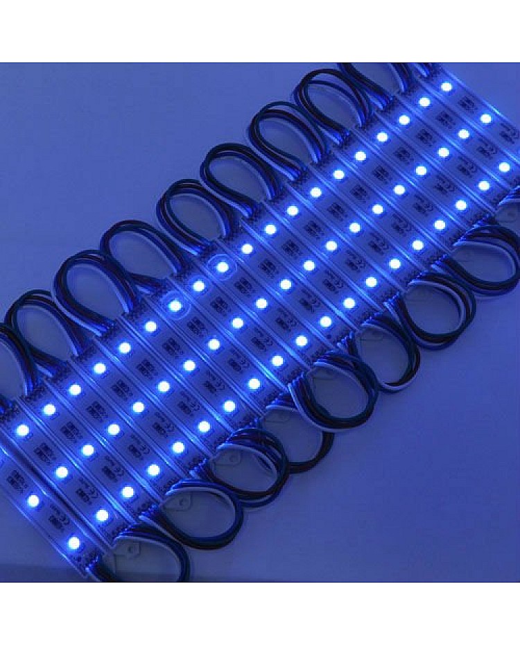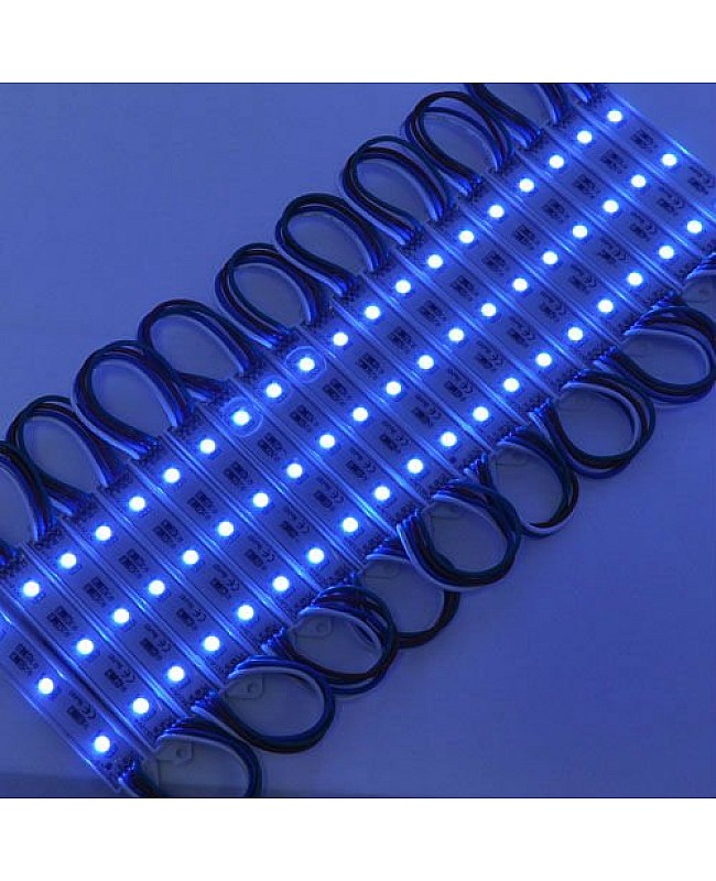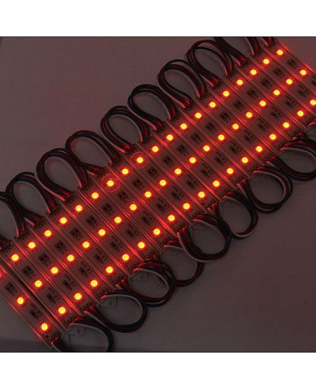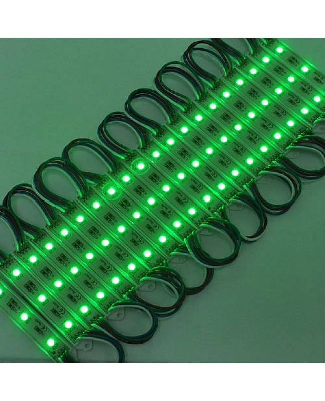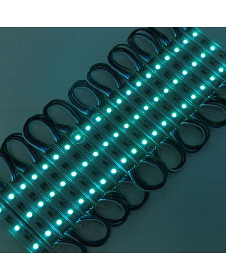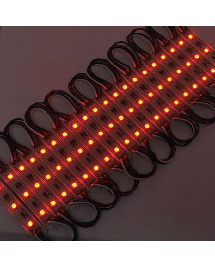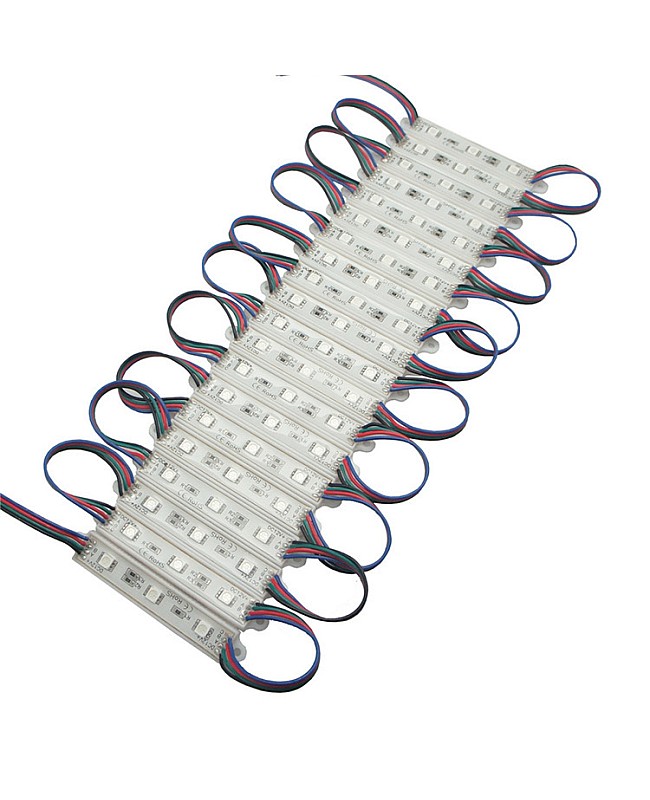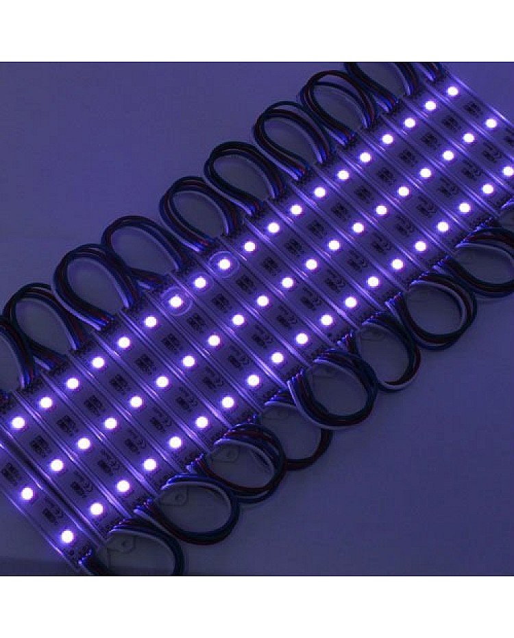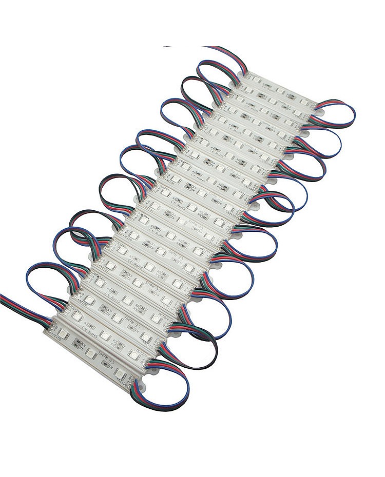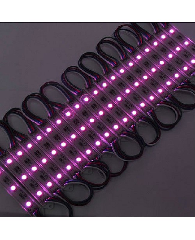 The waterproof 5050 RGB LED module, with a fireproof ABS shell, uses 3PCS high-quality 5050 SMD LEDs as light sources. It is epoxy-sealed, with an IP rating of IP65, making it suitable for indoor and outdoor applications. The RGB LED modules work in DC12V, are safe for children and pets, and easily connect to the 12VDC LED adaptor and the RGB LED controller to light up and change the static colors or dynamic modes. 20PCS per string, cuttable and reconnectable, the wire length between modules is 10cm, you can cut any quantity and reconnect them for your project, the back is with double-sided adhesive tape, take off the protector on the tape and stick it on the place you want to install. The 5050 RGB LED light modules are widely applied to backlight the signs, channel letters, billboards, advertisement lighting, holiday decorations, etc.