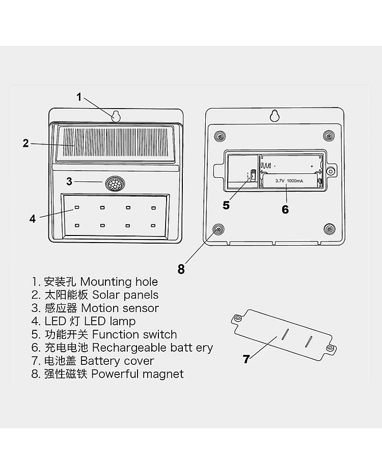 Check the waterproof solar-powered LED wall light. Use the 8PCS high-quality 2835 SMD LEDs as the light source; the lumens can reach 190 lm, equivalent to a 60W Incandescent lamp. The LED Solar Lamp with the inverted triangle waterproof structure, IP65 waterproof, can be installed on the wall. Comes with 2PCS Li-ion batteries and a solar panel. The solar panel will charge the Li-ion battery in the daylight, and the Li-ion battery will light up the LED Light at night. There are 3 working modes switchable: the steady on mode, PIR Sensor + Weak Light mode, and PIR mode. When you choose the constant on mode, the LED Lamp turns on when it is day or night. If you select the PIR + Weak Light mode, it will turn on automatically when you get close to the Solar Lamp. 10 seconds after you leave, it will change to weak light status.