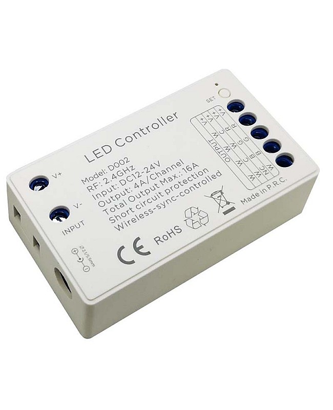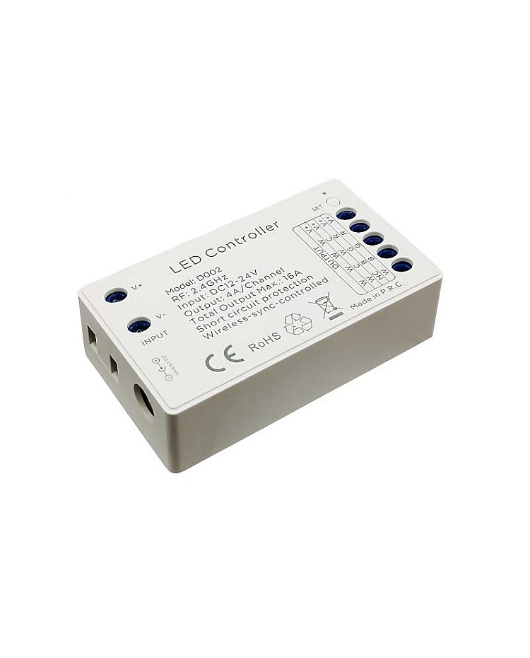 The wireless sync LED controller adopts the most advanced PWM digital control technology and is designed for DIM/CCT/RGB/RGBW constant voltage LED lights. It works on DC12V or DC24V, with a 4-channel design, and the max current of each channel is 4A, the max loading power is up to 384W when working in 24VDC. The sync LED controller integrated four optional programs for different color type of LED lights, single color/CW+WW/RGB/RGBW, the 2.4G 4 zones RF remote control included, four zones separately control or all-control, the wireless RGB LED controller in both static color and dynamic modes, 1024 static colors(RGB/RGBW) and soft dim function, the brightness of the static color are adjustable, 1024 levels in total, the speed of dynamic changes adjustable, 100 levels in total. You can long-press the brightness and speed keys to get the fast adjustment, which is convenient for operation. The RF remote control has four zones, separately controlled or all-control design, and batch operation is available for RF code matching or clearing between the remote control and receivers.