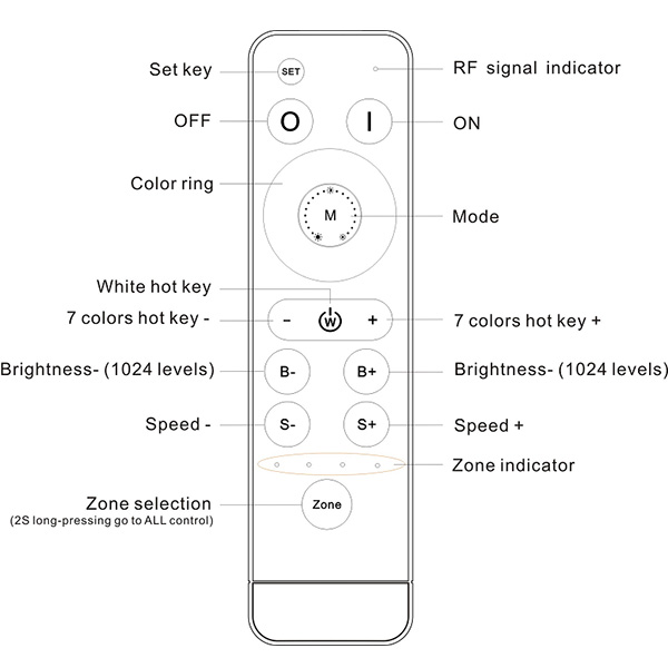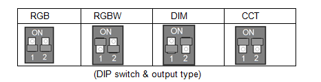 The wireless sync controller for LED lights with a 4-In-1 design can be used for single color, tunable white, RGB, and RGBW. The wireless LED controller adopts the most advanced PWM digital control technology for controlling constant voltage strip lights, LED lamps, point-source lights, LED modules, and LED strings. It has a low-voltage DC input and 5 output interfaces, working on DC12V or DC24V. There is a DIP switch for LED color type selection. 4 options are available: RGB, RGBW, DIM, and CCT. Please ensure the DIP switch is correct according to the loading LED type. The RF remote control is included, which is powered by 2 AAA batteries and works on DC3V. You can use the RF remote to adjust the brightness and color temperature or choose the static color or dynamic mode. The brightness of the static color is adjustable, with 1024 levels in total. The speed of dynamic changes is adjustable, with 100 levels in total. Each time powered on, the wireless RGB LED controller with memory function remembers the mode that was stopped last. The remote has a 4-zone design; you can press the "Zone" button to select the zone and control the zones separately, or long-pressing 2S goes to overall control.