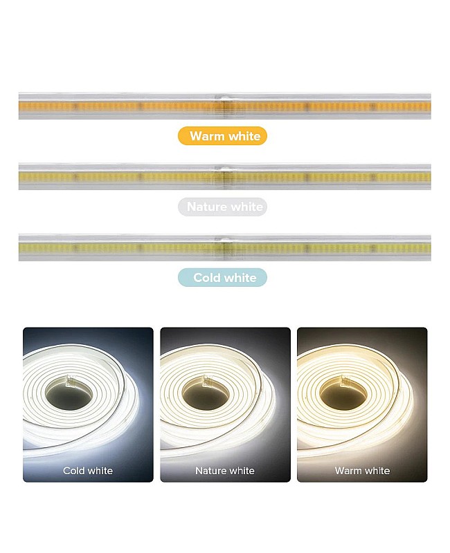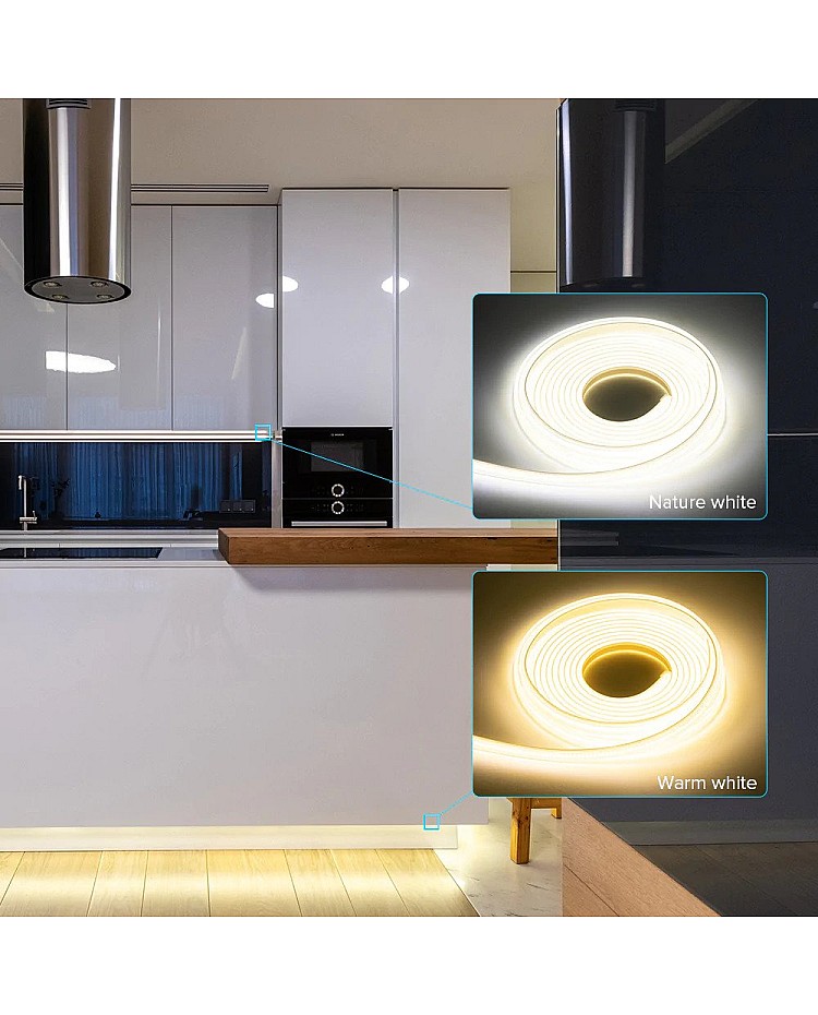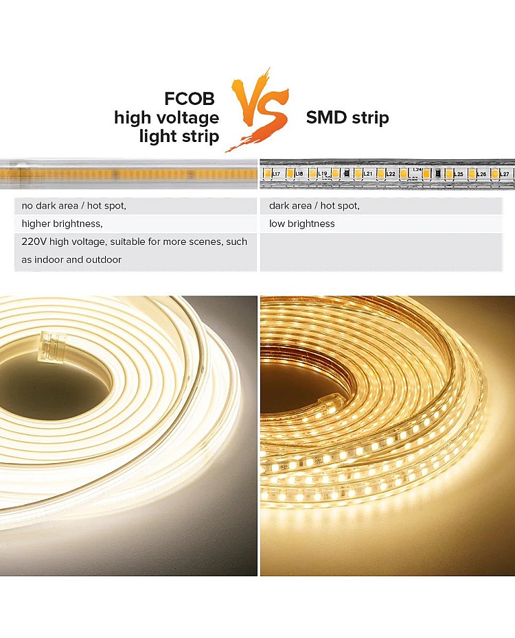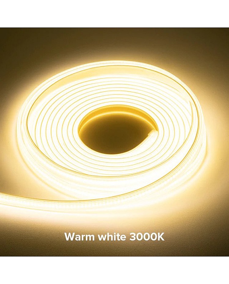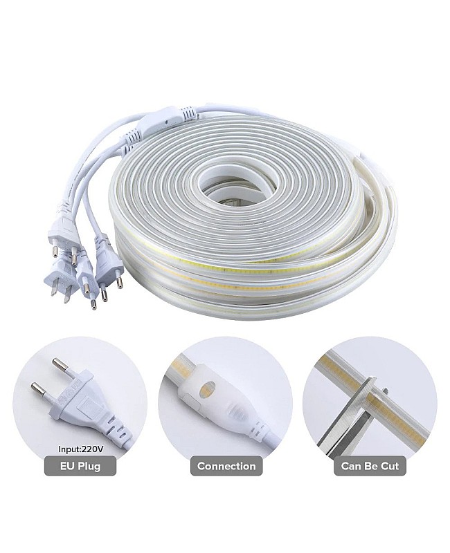 The high voltage AC220V COB LED strip lights, which use the high-quality San An 1015 LED chips as the light source, 288PCS or 420PCS LED chips mounted on every meter double-layer PCB board, with the chip-on-board-technology, the high-density LED chips allow super brightness than SMD LED strips, no visible light dots, and dark area, to create seamless linear lighting for outdoor applications. The outer layer with a PCB tube allows the waterproof level up to IP65, and you can install them in a damp location. The high-voltage COB LED strips working on AC220V can be connected directly to the public power system, and EU and US power plugs are available. They can be cut to any length for your project, and the mini-cutting length is 50cm. You can use the waterproof high-voltage LED strip connector to reconnect the cutting part easily. There are three emitting color products available, and you can choose the 3000K warm white, 4000K natural white, and 6500K cool white for various scenes. The silicone clips and screws are included, and it is easy to mount them on the wall or the ceiling for a lighting project; you can use them in hallways, stairs, trails, windows, kitchen and bathroom, garden lighting, etc.
