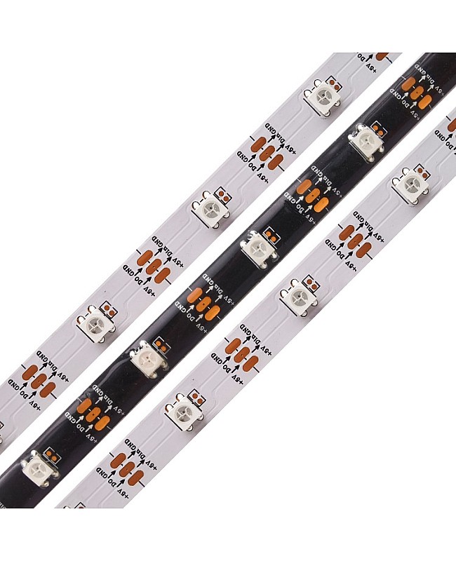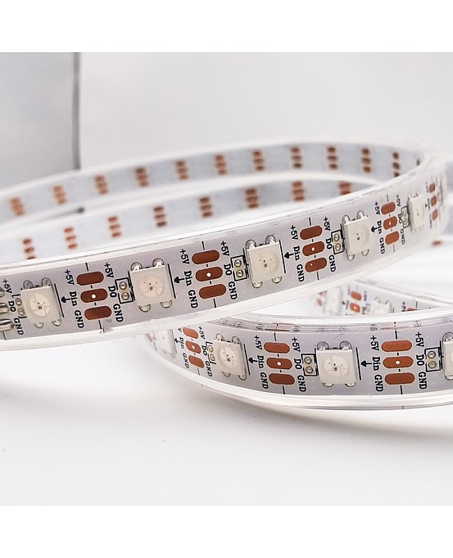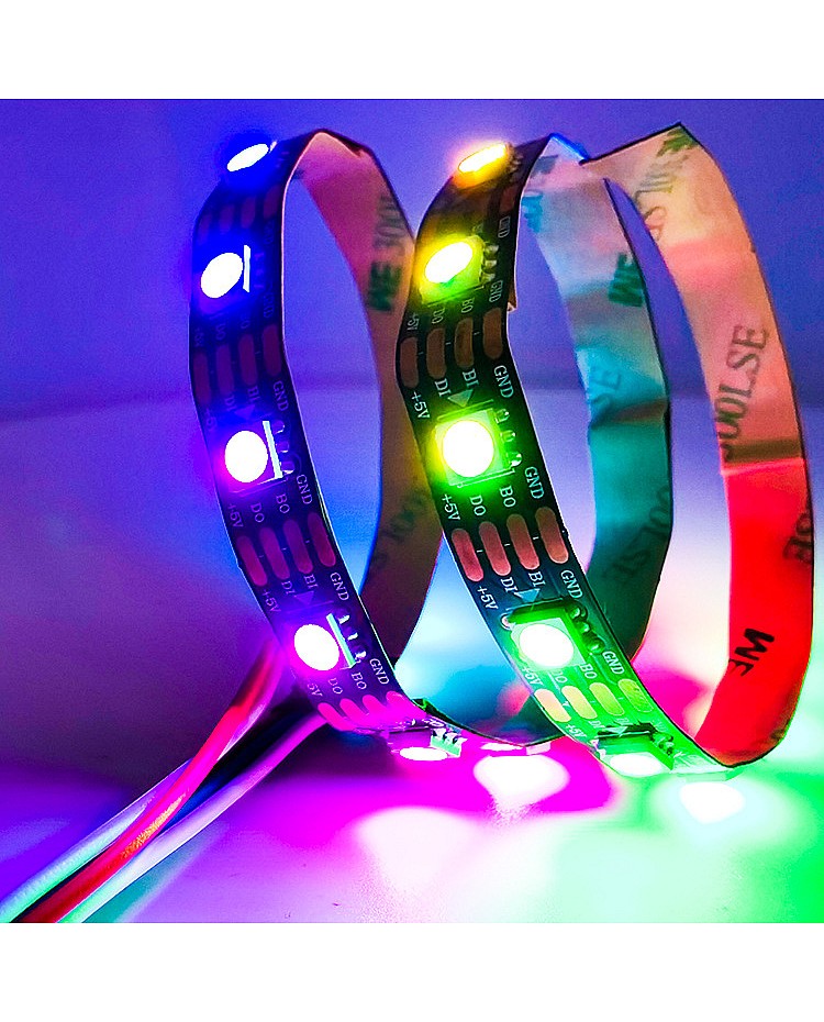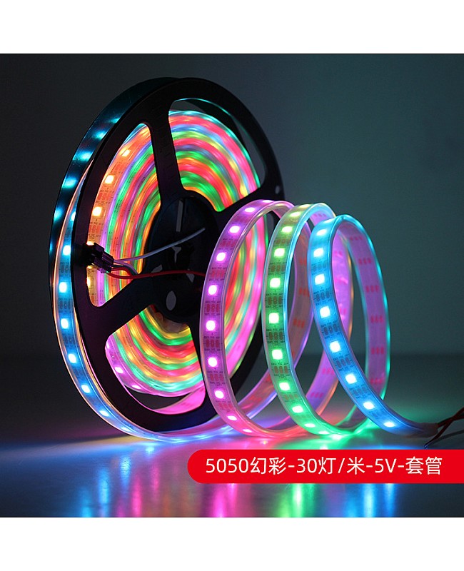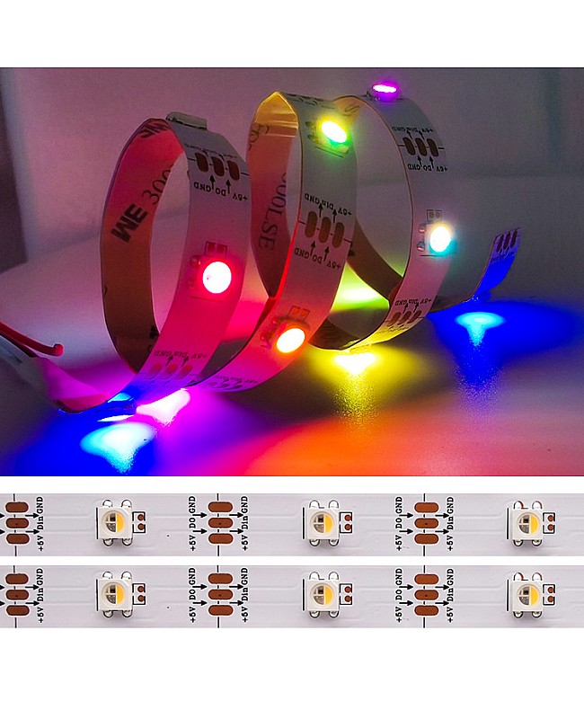 Check the individually addressable Digital RGB LED Strips, 5 meters per reel, use the high-quality 5050 SMD LEDs as the light source, 30LEDs and 60LEDs per meter available, the addressable IC built-in the SMD LEDs, each pixel have its color and brightness, only can work with the dream color LED Controller and the input voltage is DC5V, please do not try the DC12V or DC24V, after connected to the Controllers, the Digital LED Strips will appear the advanced lighting effects like dream full color, curtain-up, flow water, raindrop, jump, flash and other hundreds of lighting effects. The Programmable LED Strip Lights feature 3-pin JST-SM connectors for easy installation, as well as separate power and ground wires on both ends. Each LED can be cut off without damaging the entire LED Strip; you can cut to any desired size. We recommend adding a DC5V voltage every 5 meters, as the LEDs at the far end of the strips may be dimmer due to the added resistance and voltage drop that occurs as the current flows to that end of the Strips. there are four different waterproof level products available, IP20, IP65, IP67 and IP68, recommend the IP20 and IP65 work indoor, IP67 and IP68 work outdoor.