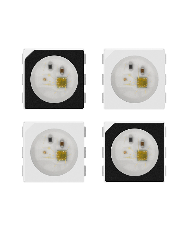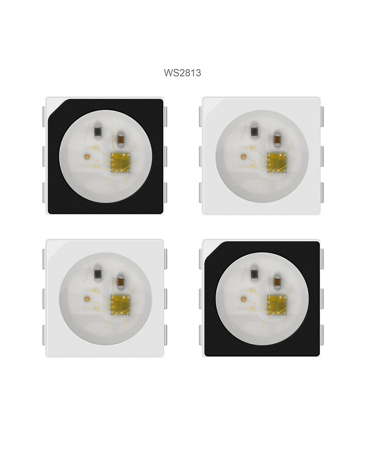 The WS2813 SMD 5050 RGB LEDs are an upgraded version of WS2812B LEDs, have 6 pins, and a dual-signal wire version for signal break-point continuous transmission. The LEDs include red, blue, and green LED chips, also built-in WS2813 IC for individually addressable function, control circuit, and LED share only power source, using the built-in signal reshaping circuit to achieve the signal waveform shaping, and no distortion of the waveform of the signal takes place. Built-in power-on reset and brown-out reset circuits. The gray levels of each Pixel are 256 levels, which will achieve 16 million colors, and the refresh frequency reaches 2KHz/s. There are two surface colors of LEDs available, black and white. You can use them for your DIY lighting projects or to replace the broken LEDs on your WS2813 LED Strips.