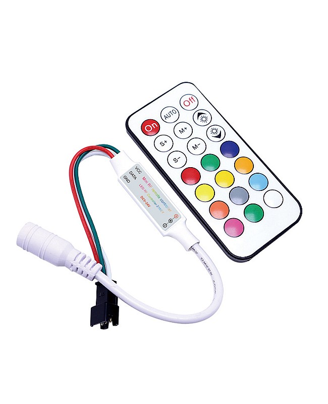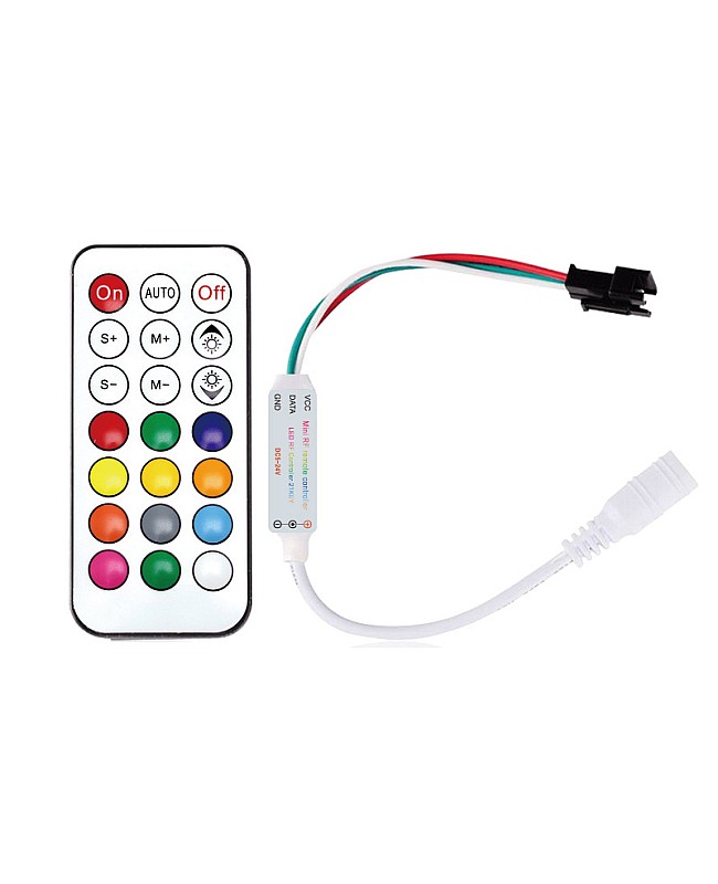 The addressable pixel WS2812B controller is a small size and an inline design, and you can install it in a small or narrow location. It comes with a female DC connector and a 3-pin female connector, which makes it easy to connect to the LED light driver and programmable LED strip lights. The 21-key RF remote control is included, and you can use it to control the LED light remotely. The pixel controller is compatible with WS2811, SK6812, WS2812B, 6803, 6812, 1903, and other main types of pixel LED strips with 3-wire connectors, with a maximum loading number of pixels of up to 1024PCS. There are 366 types of adjustable lighting effects. You can use the remote to adjust the brightness of static colors or the speed of dynamic modes.