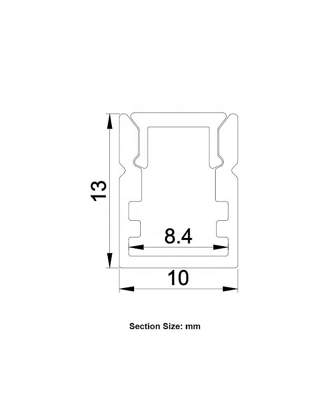 The 10mm aluminum LED extrusions are perfect for clean, modern, and space-saving strip lighting installation. The low-profile light channels accommodate 8mm strip lights, making it ideal for tight or narrow spaces. They come with snap-on diffusers to produce smooth, glare-free illumination with reduced LED dotting. They are made of 6063-T5 aluminum alloy with an anodized surface for anti-oxidation resistance and a longer lifespan. The standard lengths are 1 m and 2 m, and they can be cut to any size that fits your project. Two types of diffused covers are available: PC frosted and black PC covers. They are made from brand table material, feature anti-yellowing properties, and have perfect light distribution. The inner width of the LED light extrusion is 8.4mm, allowing a maximum LED strip width of 8 mm. End caps and metal clips are included for easy surface-mounted installation.