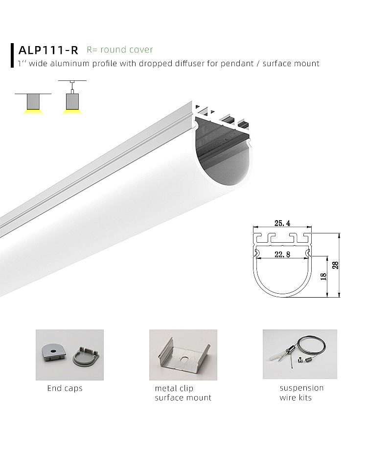 The aluminum LED light profile with a round cover is designed for clean illumination, excellent heat dissipation, and a professional finish. The rounded diffuser will keep the LED strip lights away from dust and moisture while evenly diffusing the light and allowing it to be viewed at a wide angle. Ideal for work surfaces, kitchen cabinetry, office desks, shelving, and display cases. The inner width is 22.8mm, allowing a maximum strip light width of 22mm. The LED light strip profiles are made of high-grade aluminum alloy with a silver anodized surface finish for anti-oxidation resistance, giving them a sleek look. The standard length is 1M, and the max length is 2M; it can be cut to any length suitable for your LED projects. The round diffuser cover for LED strip lights delivers smooth, soft, dot-free illumination, perfect for task lighting where clarity and comfort matter. It has a clip-in design that makes installation and removal easy. End caps with and without wire holes are included, making it easy to connect the strip lights to LED drivers, and the aluminum LED profiles work as heat sinks for better heat dissipation. The metal clips are included for surface-mounted installation, and stainless steel wires are sold separately for pendant installation. Two types of metal joiners are available: 90° and 180°. You can use them for angle and straight connections.