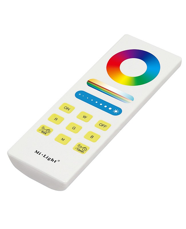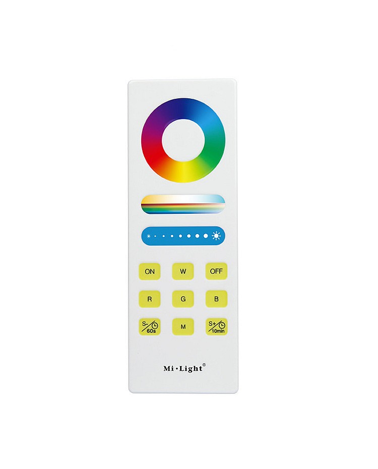 The battery-powered MiBoxer FUT088 full touch remote controls are designed for the RGB+CCT LED lights, feature a new appearance, more sensitive touch, and are easy to use. You can touch the color ring to adjust the color from 16 million colors, and saturation control is available to create any light atmosphere. Touch the CCT control slider; you can adjust the color temperature from 2700K to 6500 K. You can also touch the dimming slider to adjust the brightness from 1% to 100%. The MiBoxer remote has 2.4G wireless transmitting technology, which you can use to control any LED controller within 30 meters. With the delay-off light design, touch the buttons " 60S" or "10min"; the light will be turned off automatically after 10 seconds or 10 minutes.