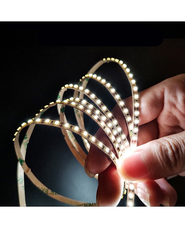 The 12V battery-powered small LED strip lights are 2.7mm or 4mm wide, which allows them to be installed easily and add soft, ambient lighting in a small or limited space. They use the small 2016 SMD LEDs as the light source; each meter has 198 LEDs. Three emitting color products are available: 3000K warm white, 4000K natural white, and 6500K cool white. The back has double-sided adhesive tape, which makes it easy to stick on the surface where you want to install it. The small-width LED strips are cuttable; the minimum cutting length is 10mm, and you can cut to any size for your project. Because of the low power consumption, the 12V super-narrow LED stripes can be powered by batteries, power banks, and UPS. They can work with WiFi smart light dimmers to adjust the brightness for various scenes. Perfect for accent lighting or creating a cozy atmosphere in cars, cabinets, bedrooms, walls, etc. These Strip Lights are versatile and can be used in various settings.