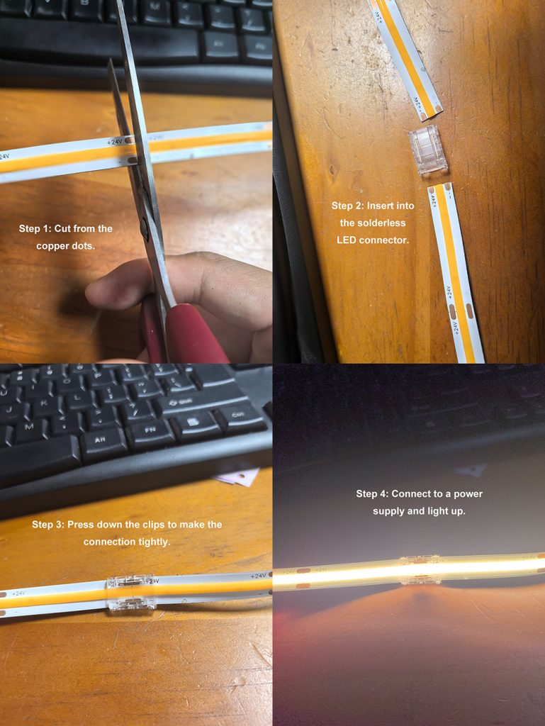 - Use the Solderless LED Connectors: This is the easiest way to reconnect them. They are allowed to connect cut strip lights together or connect to wires. There are straight, L-shaped, and T-shaped ones available.