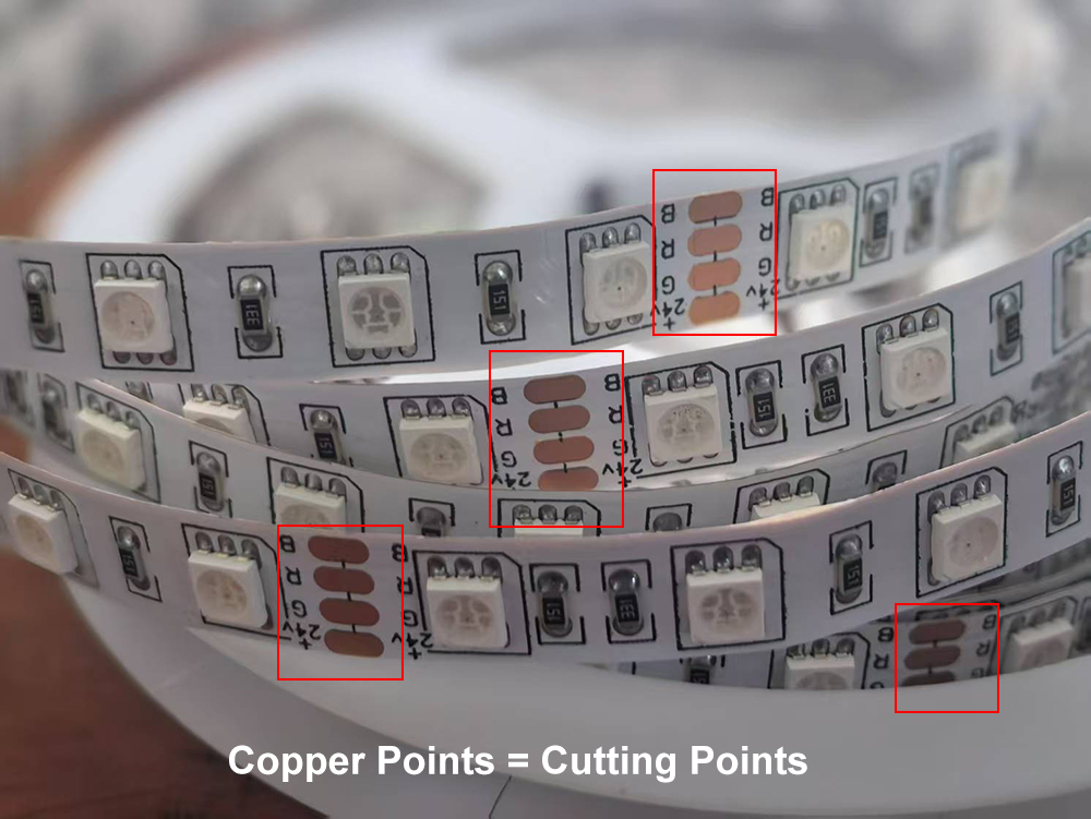 Not everywhere on the LED tapes is safe to cut; the correct cutting points are scissor icons or copper points, usually where you can safely separate the strips.