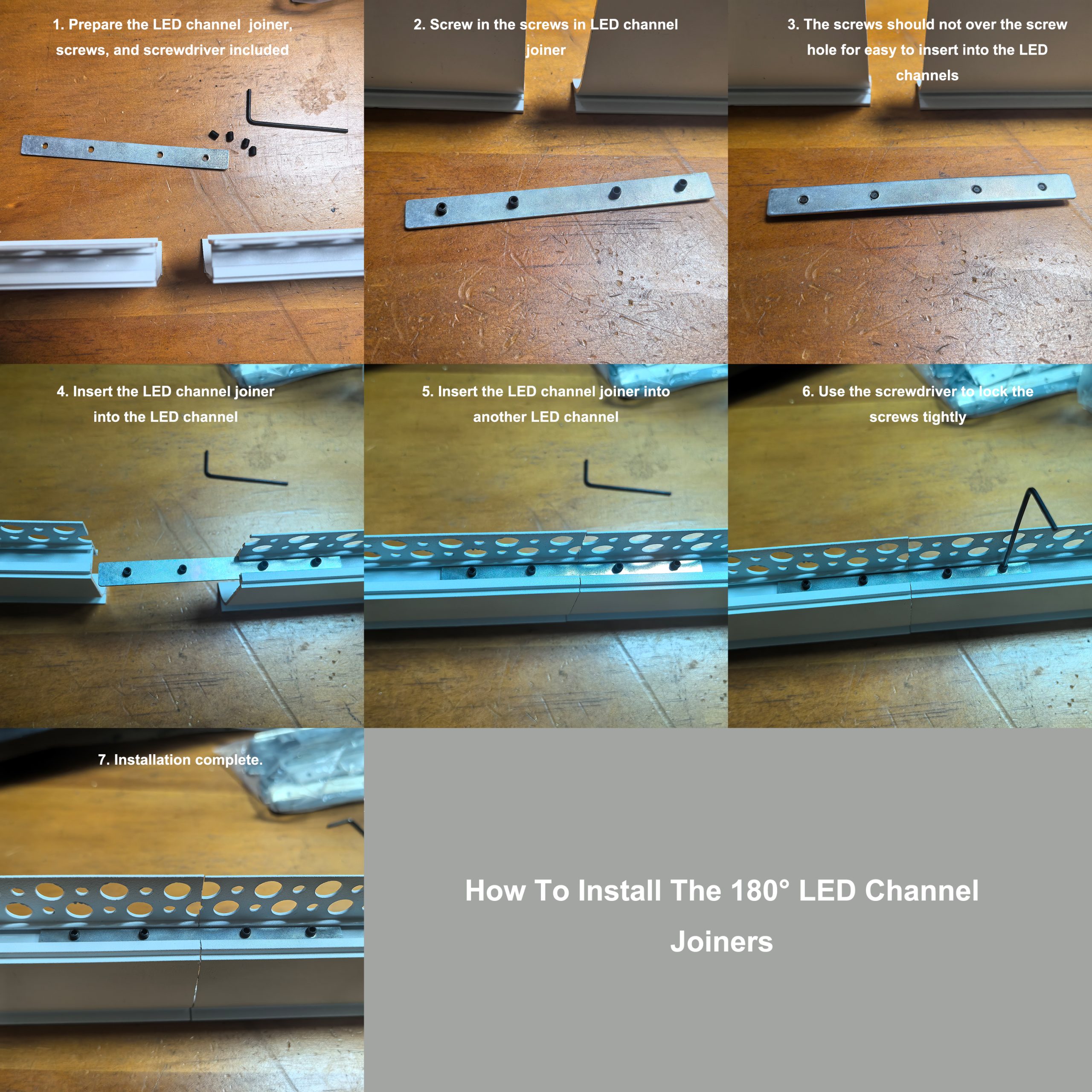 - Then screw in the screws into the joiners. Please ensure the screws do not go beyond the screw hole to facilitate easy insertion into the LED channels.