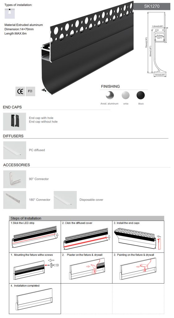 We recommend our SK1270 LED Channels to add baseboard lighting to your room. There are three colors available: silver, white, and black. The standard length in stock is 2 meters per piece, and you can cut to any size you desire. Come with PC Diffused Covers to diffuse the LED Strip Lights to create soft ambient lighting following the footline. Please check the picture below to learn what you need and how to install them.