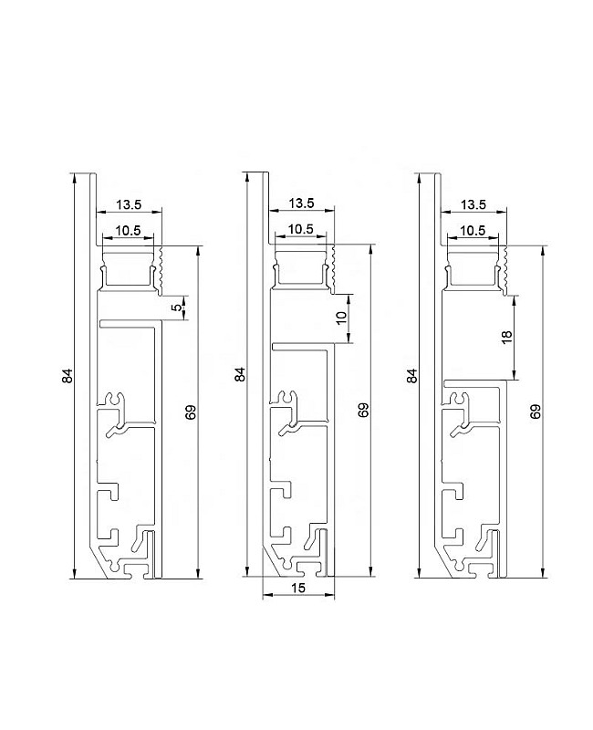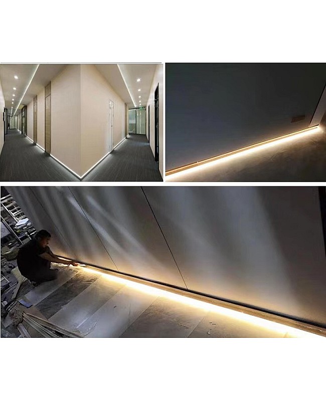 The cabinet toe kick moulding lighting profiles allow the creation of a beautiful linear lighting look along the foot line under the cabinets and provide a sleek, modern look. Three light space products are available: 5mm, 10mm, and 18mm. The inner width is 10.5mm, allowing the maximum width of LED strips to be 10mm. Recommended using the dotless COB LED strips as the light source; you can use them to light up the floor areas. LED cabinet kickboard channels are made of 6063-T5 aluminum alloy with silver anodized surface treatment, anti-oxidation resistance, and a longer lifespan than similar products. The standard lengths are 1M and 2M, and you can cut to any length for your project. The 90° and 180° connectors are sold separately, and you can use them to reconnect the kitchen cabinet toe kick profiles together. Only one type of diffuser is available: the PC diffused Cover, which is made of brand-stable material, anti-yellowing, with perfect light distribution and even light output. End caps with wire holes are included, and it is easy to connect the LED strips to a 12V LED driver to light up. They can be used as a heat sink for better heat dissipation. They provide both functionality and aesthetics, enhancing the overall look of your cabinets.