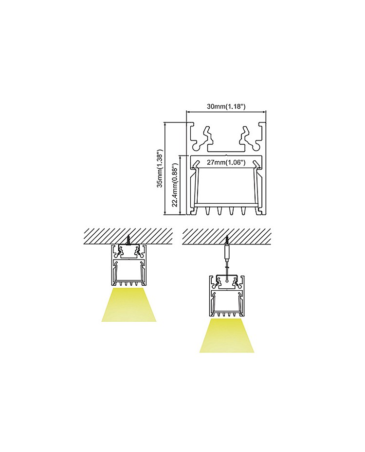 The LED strip aluminum channels come with accessories that support both surface-mounted and suspended installations. They provide durable, stylish housing for LED strips, ensuring even, eye-friendly light distribution that is perfect for modern pendant fixtures. Four types of diffusers are available: white and black anti-glare covers with ribs, PC frosted covers, and prismatic covers. The anti-glare diffused covers will soften light output, reducing hotspots and glare for comfortable hanging lighting. Ideal for offices, retail spaces, showrooms, and modern interiors. The ceiling LED channels are made of 6063-T5 extruded aluminum alloy and feature a silver anodized or white/black powder-coated finish for oxidation resistance and long-lasting performance. The inner width is 27 mm, allowing a maximum LED strip width of 26 mm. Recommend adding high-density LED COB strips as the light source to create a consistent line of light without hot spots and dark areas. Surface-mounted LED channels can act as heat sinks, improving heat dissipation and extending LED light lifespan. The stock length is 2 meters per piece and can be cut to any size for your needs. Accessories include end caps, mounting clips, and steel suspension wires for easy installation.