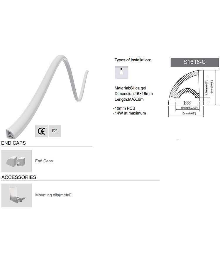 The silicone LED channels feature a 45° inclined lighting design and are bendable, weatherproof solutions for curved and angled installations. Perfect for both indoor and outdoor use, this channel provides a sleek, angled light diffusion while protecting the LED strips from moisture, dust, and damage. They are made of silicone material, which makes them highly flexible and heat-resistant, allowing for easy bending and shaping. The IP rating is IP67, which provides waterproof and dustproof capabilities, making it suitable for use in wet environments. The unique 45° angle allows more light to be dispersed, creating a uniform lighting effect. The inner width is 10.8 mm, allowing for a maximum strip light width of 10 mm. You can install either 8mm or 10mm COB flexible LED strips as the light source. A rope is included; tie a string around the LED strip and cross the flexible LED channel to complete the installation. End caps with wire holes are included, making it easy to connect to the waterproof LED adapters or LED controllers. The metal mounting clips are included, making mounting easy. The standard roll length is 5 meters (16.4 ft), and the maximum roll length is 50 meters. You can easily cut to any size.