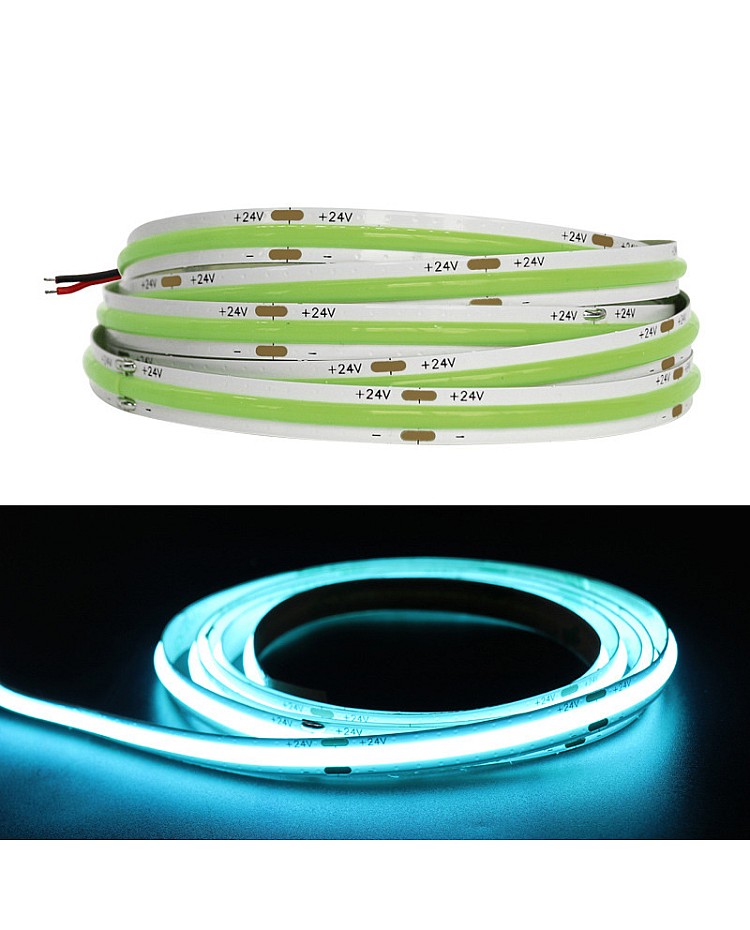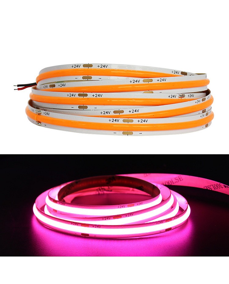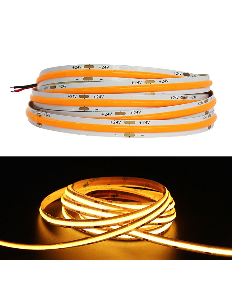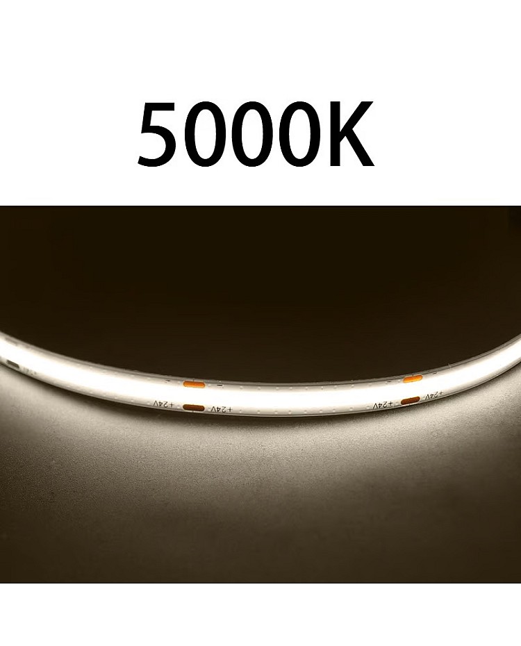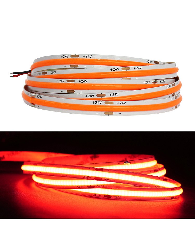 The COB 5M LED Strips, featuring the new COB LED technology, produce seamless LED linear strip lights without the need for an extra diffuser cover. Use the 1022 LEDs as the light source and the LED Chips made by the San An company. 5 meters per reel, 480PCS LEDs per meter, the COB refers to the mounting of a bare LED Chip in direct contact with a substrate to produce LED arrays, which allows for a much higher packing density of the LED array, high density, high CRI, high brightness, uniform light emission, no light dots and no dark area, high efficiency, and longer lifespan. The back side of the COB LED strips features double-sided adhesive tape, making installation and use easy. Remove the protector from the tape and adhere it to the desired installation location. The COB LED Strips are cuttable and reconnectable, allowing you to cut them to any size for your projects. Follow the cutting marks and reconnect them with the COB LED Connectors. The minimum cuttable length of 12V products is 25mm, and the minimum cuttable size for 24V COB Strips is 50mm. Various emitting colors are available, allowing you to choose from Red, Pink, Yellow, Blue, Ice Blue, Green, Purple, and more. Connecting the COB LED Strip Lights to an LED power supply allows for easy lighting or linking to an LED Dimmer to adjust the brightness for various scenes. It is ideal for indoor occasions, such as the kitchen, cabinet, living room, wardrobes, mirrors, stairs, wine cabinets, and bookshelves.