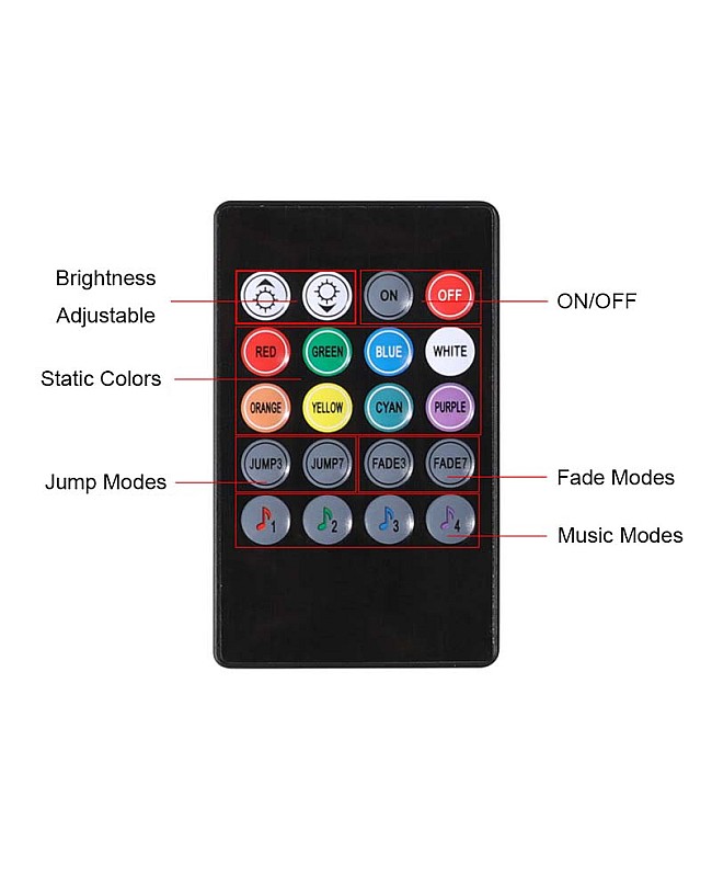 - 8 Static Colors, 2 Jump Modes, 2 Fade Modes, And 4 Music Modes