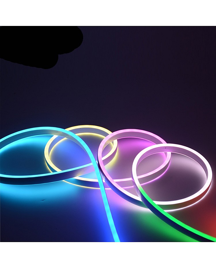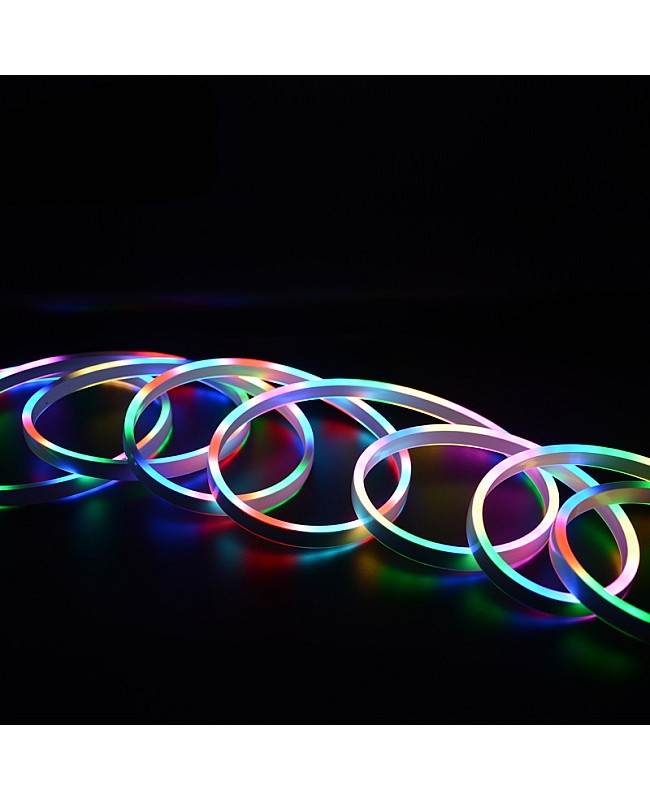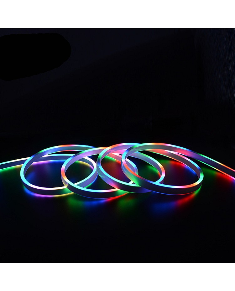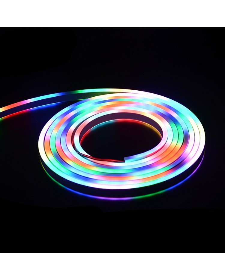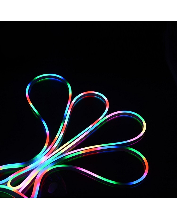 The magic RGB neon flex LED strips have a double-sided lighting design, and the width is only 6mm. You can use them for indoor and outdoor decoration applications. The neon flexible LED strips use high-quality 3838 RGB SMD LEDs as the light source, 72PCS per meter LEDs mounted on the dual-layer PCB board and sealed in the silicone rubber sleeves, the waterproof level reaches IP68, you can install them in a wet location, good flexibility, can withstand extrusion, using environmentally friendly silicone material, can bend into a variety of text or graphics. The magic RGB neon strip lights use the MT1806 IC to control the SMD LEDs to achieve fantastic lighting effects. Each IC driver 3PCS LEDs(6PCS LEDs in 24VDC), easy to connect to the pixel LED controller to achieve hundreds of amazing lighting effects, like chasing, fire, rainbow, meteor, etc.
