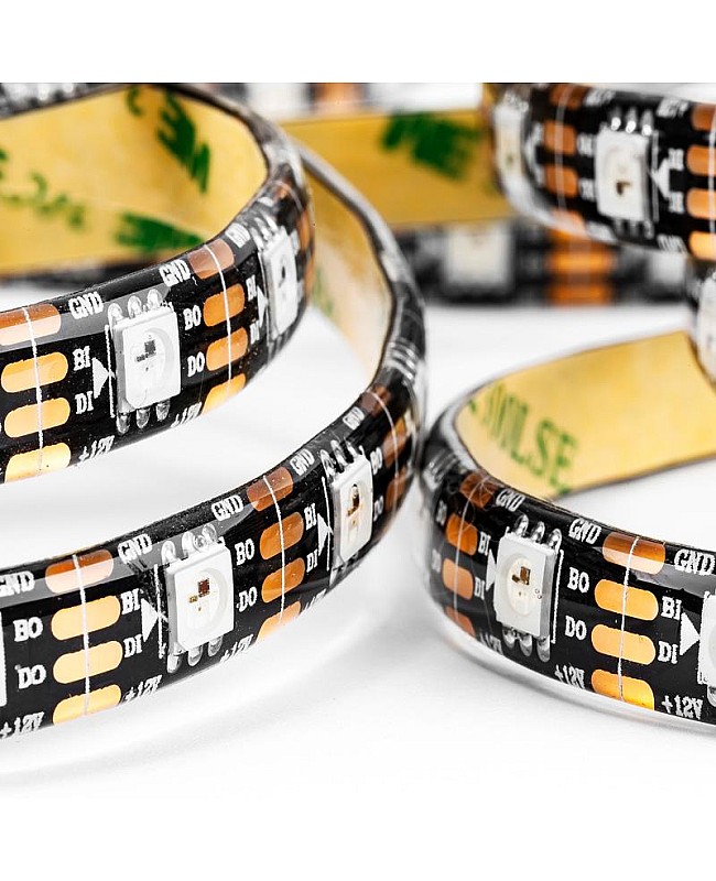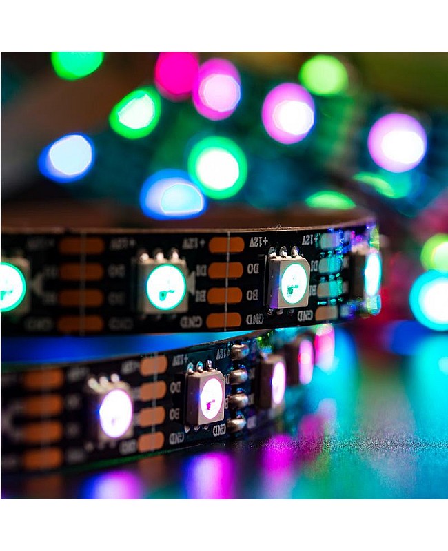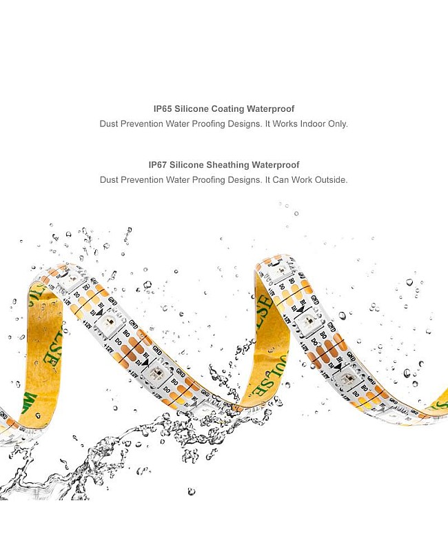 The Dual Signal Individually Addressable WS2815 LED Strips are perfect for creating unique lighting displays. Utilize high-quality 5050 RGB SMD LEDs as the light source, enabling you to control each LED individually for more intricate lighting effects. With a dual signal wire design, continuous transmission is ensured even in the event of a signal break. Various LED quantities and lengths of products are available: 30 LEDs/m, 60 LEDs/m, and 144 LEDs/m; the length you can choose is 1 m or 5m. The WS2815 Strip Lights operate on DC 12V and are compatible with Digital LED Controllers like SP108E, SP105E, SP107E, and K-1000C, among others, to achieve thousands of fantastic lighting effects, including curtain-up, flowing water, raindrops, and jump flash. You can edit the animation effect for DIY effects with CorelDRAW, Flash, and LED Edit software. Every LED is cuttable, allowing you to trim it to any desired length for your project easily. Three waterproof levels of products are available: IP30 (non-waterproof), IP65 (coating waterproof), and IP67 (silicone tube waterproof). IP30 and IP65 for indoor projects. The back features double-sided adhesive tape, making it easy to adhere to the desired installation location. The IP67 Addressable LED Strips come with silicone mounting Clips. For outdoor applications, you can mount them in wet, damp, or waterlogged locations. With these LED Lights, you can create stunning visual effects and light displays, making them great for any lighting project.