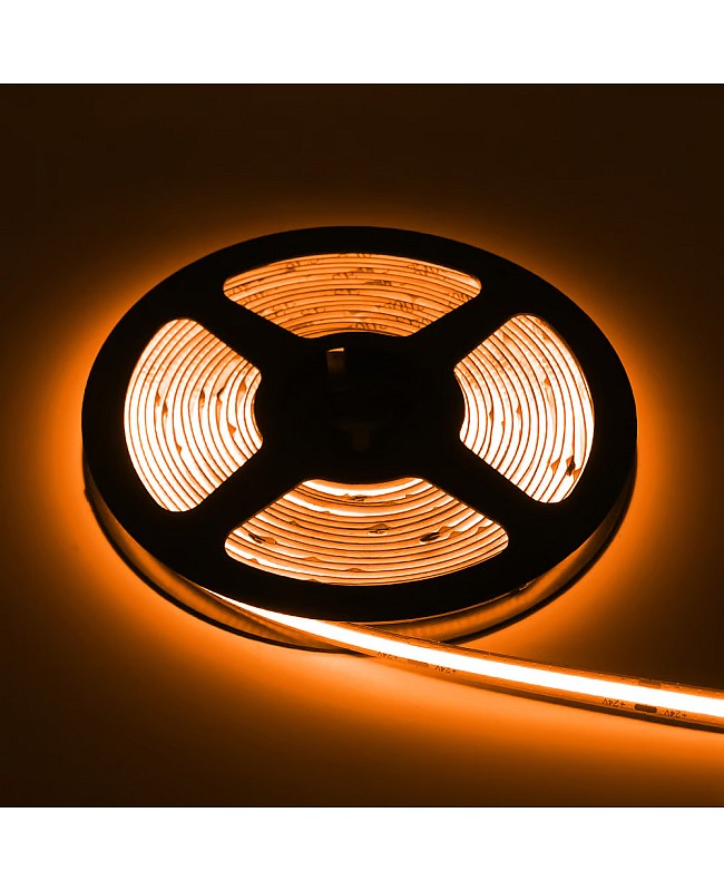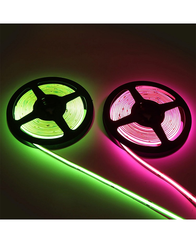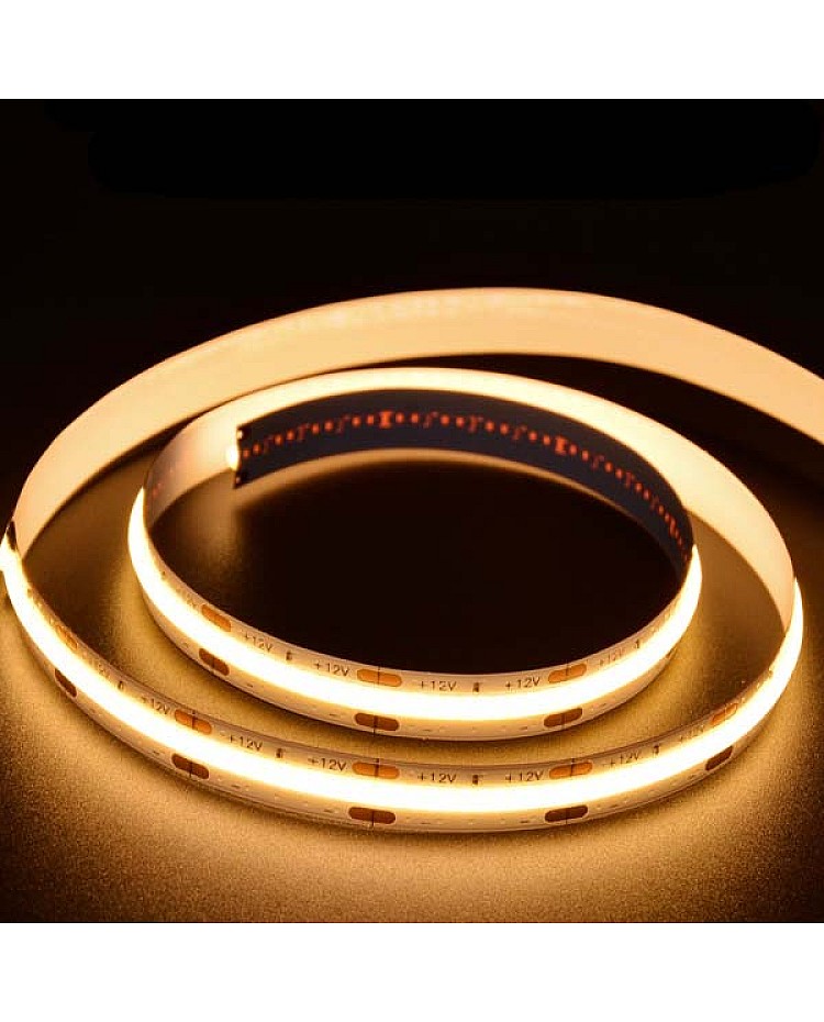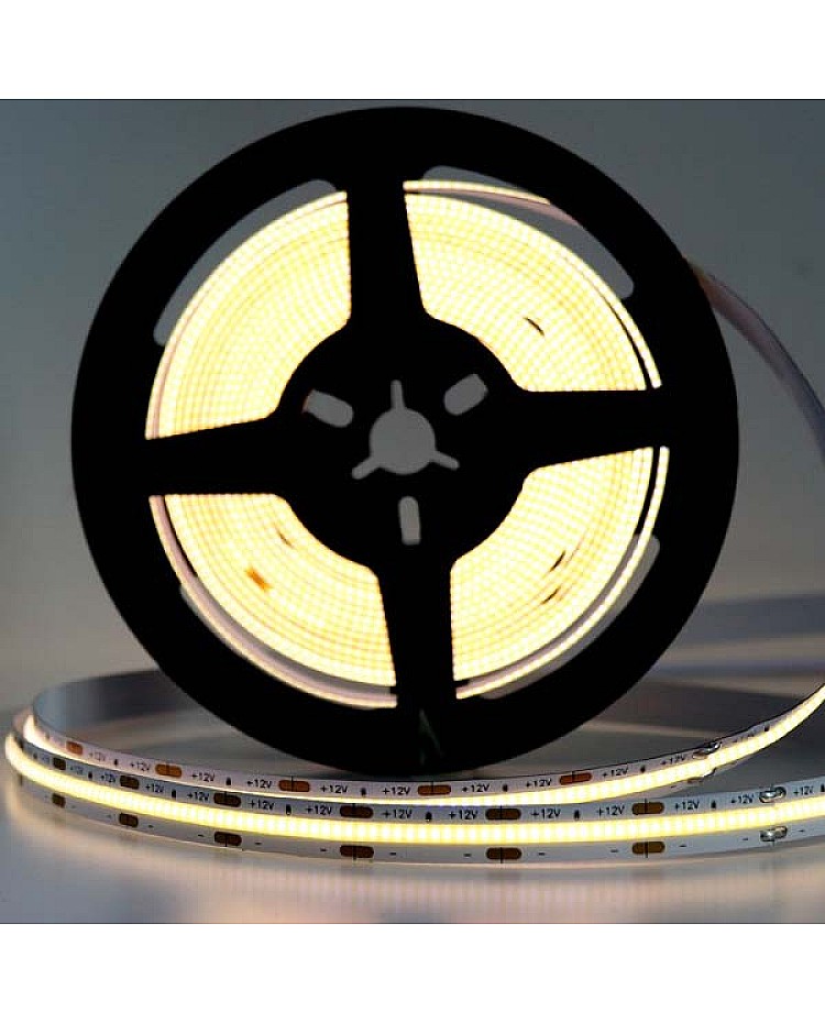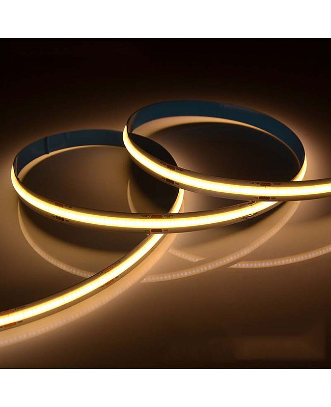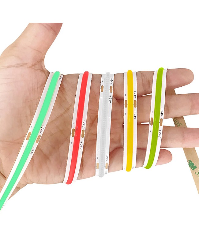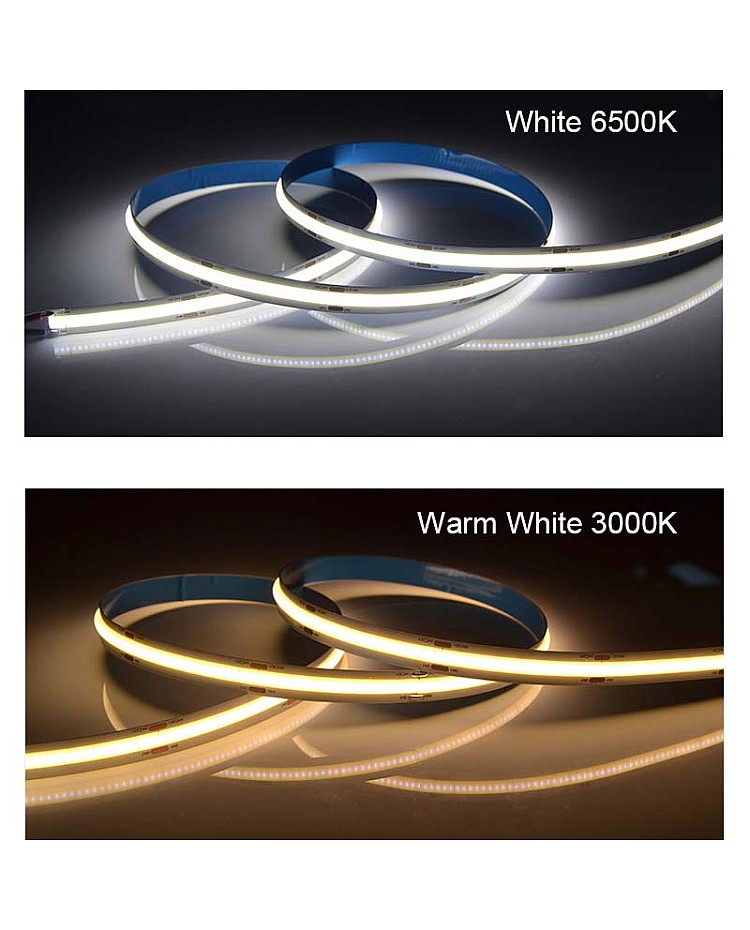 The COB flexible LED strips use the new COB LED technology, with high density LED arrays and 480PCS per meter to produce seamless linear LED lighting, no need extra diffuser. the bending radius low to 5mm, flexible bending and limitless winding, the high-density LEDs provide the excellent illumination effect that beyond your imagination, high CRI, high brightness, no hot spots and visible light dots, uniform light emission, high efficiency and longer lifespan. No need to rely on other accessories to achieve the free linear lighting effect. The COB LED light strips work in DC24V or DC12V and can be directly connected to the 24V output LED adapter to light them up. The minimum cuttable length is 25mm or 50mm, so you can freely cut the length you want for your LED Project. The back has double-sided adhesive tape; remove the protector on the tape, and you can stick it on the place you want. The waterproof level of the COB LED strips is IP20, non-waterproof, and only recommended for working in indoor applications. Various emitting colors of products are available: you can choose warm white, natural white, cool white, and other single colors. You can use them for furniture, corner projects, etc. The COB LED strips can work with LED dimmers to adjust the brightness from 0%(1%) to 100%.