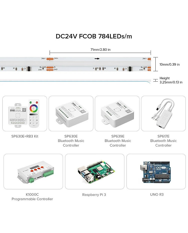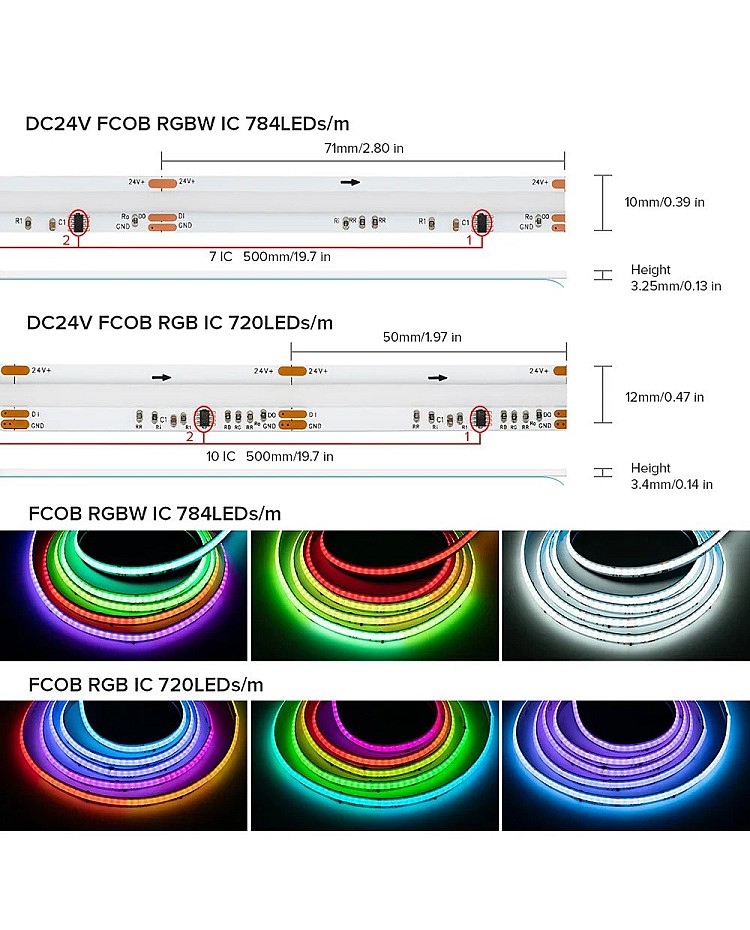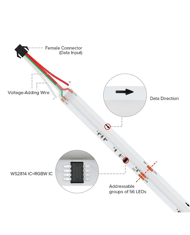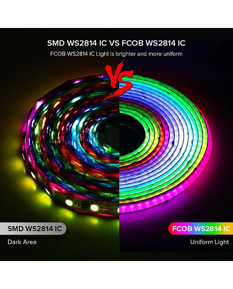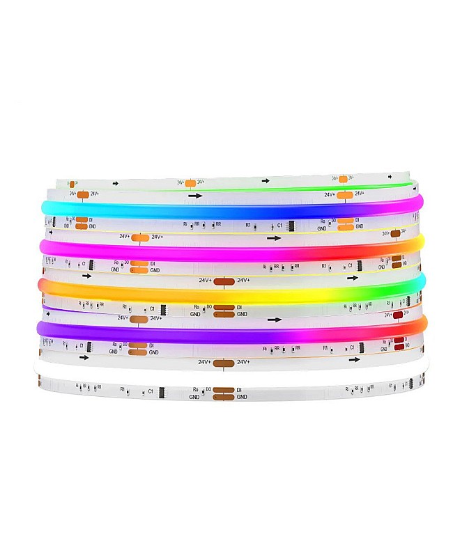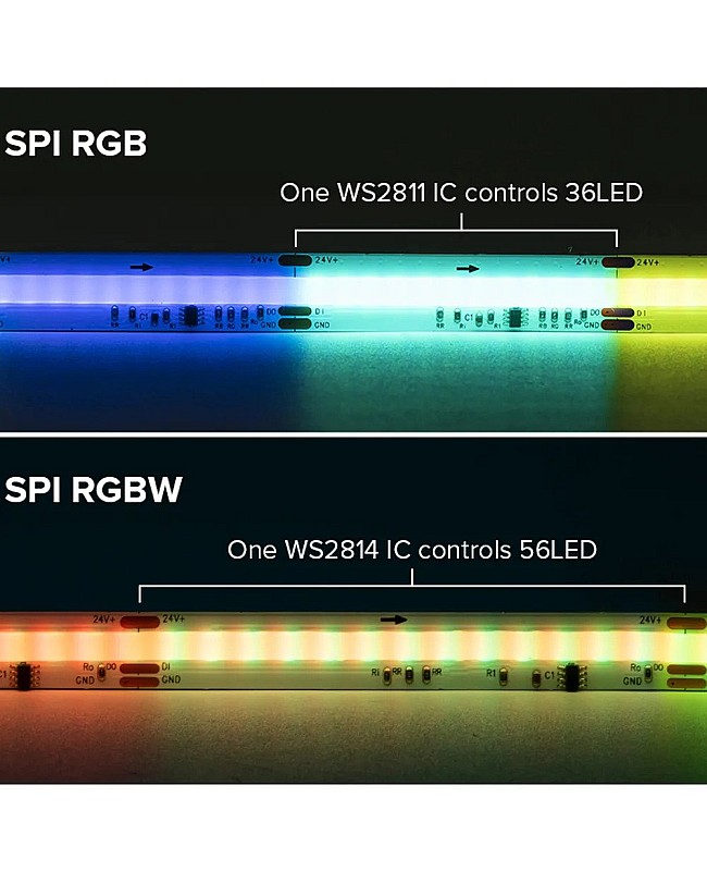 The WS2814 addressable COB RGBW LED tape lights offer incredible flexibility and vibrant colors, allowing you to create dynamic lighting patterns and effects. They can adapt to any mood or occasion, whether you want to create a soothing ambiance or a lively atmosphere. The WS2814 LED tapes utilize the latest COB (chip-on-board) technology, with 784 pieces of LED chips mounted on each meter of PCB board and controlled by 14 pieces of ICs, utilizing high-density LED chips to create a uniform lighting line with no dark areas or light spots. Can work with SP617E, SP630E, SP639E, and other pixel controllers to achieve fantastic lighting effects like curtain-up, flow water, raindrop, jump flash, and hundreds of different lighting effects. They operate at 24V DC, which is more stable than 12V, reducing voltage drop for longer runs. The pixel tape lights incorporate white LED chips, allowing you to choose from warm white, natural white, or cool white, which produce brighter and more accurate colors than RGBs. Those COB tape lights are cuttable and linkable. Both ends come with 3P connectors, male and female. Easy to connect to the controller or connect the COB LED tapes in series. The minimum cutting length is 71mm; you can cut to the desired size from the provided cutting points. The IP rating is IP30 non-waterproof. It is suitable for interior decoration in kitchens, cabinets, bedrooms, living rooms, and stairs, among other areas. And use for DIY backlight, toy lighting, etc.