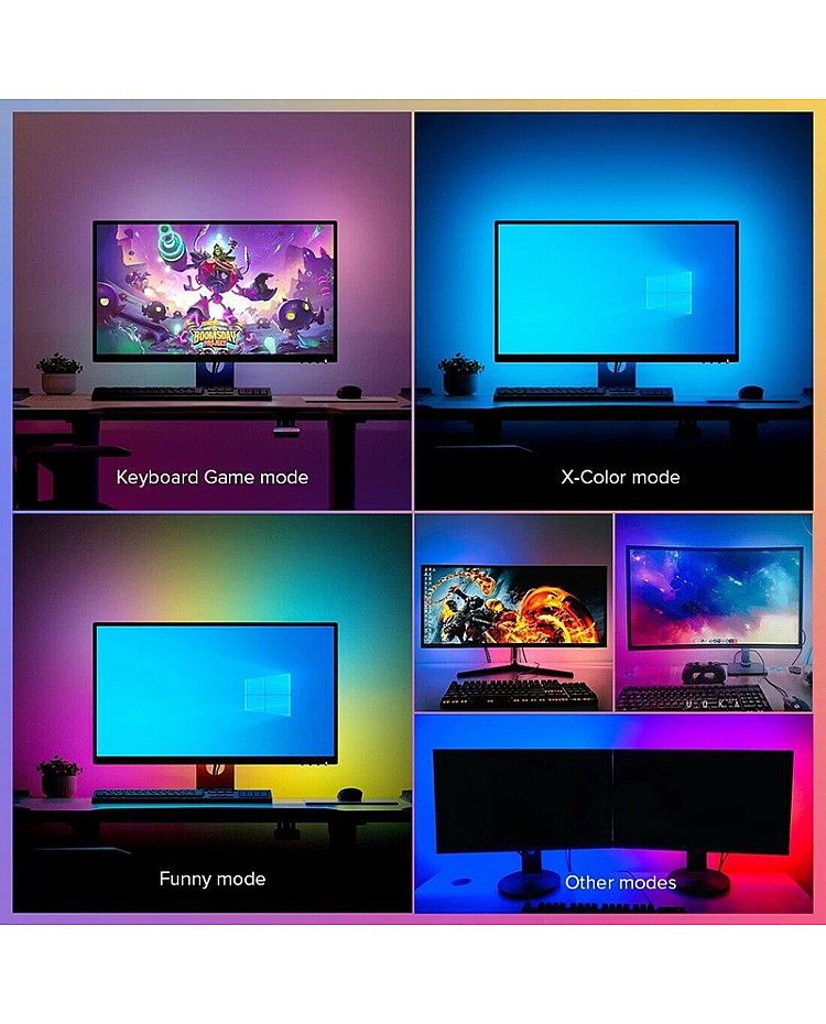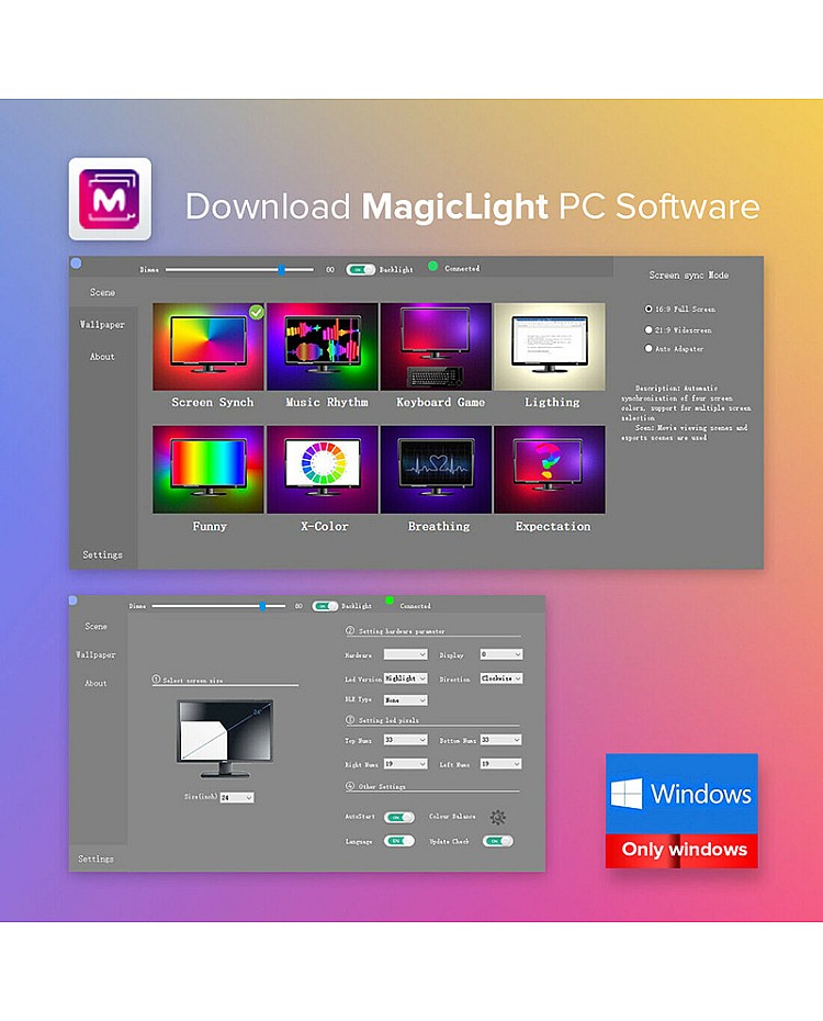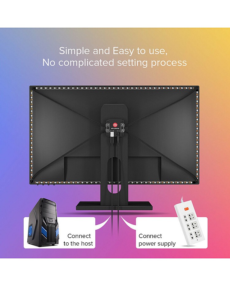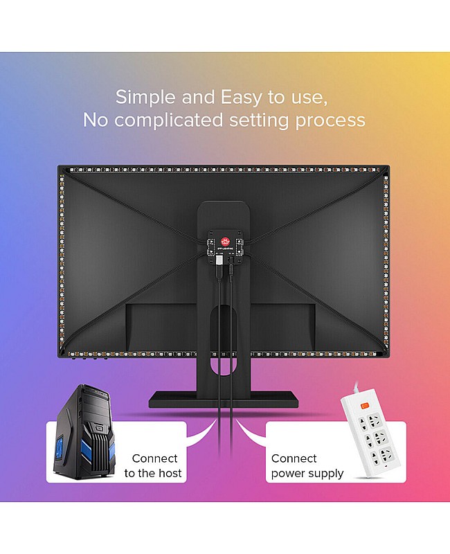 The magic color ambient lighting kit, which works with a DC 5V power supply, can only be installed on a computer screen or PC and does not support TVs. The strips use 5050 SMD LEDs as the light source. Each LED includes WS2812B IC for individually addressable, there are 4PCS LED strips, a LED power supply, controller and cable included, easy to install around the behind of the monitor, fast sync and no delay, synchronize the colors of the four sides of the display, computer keyboard linkage mode, more suitable for gaming scenes, sync to your computer's music. the smart ambient kits fit for 24 or 39 inch monitors, you can cut the length you want, the LED strips with double-sided adhesive tape, easy to stick on your PC monitor, the ambient strip lights only for the PCs that installed Window operating systems, WIN7, WIN8 and WIN10, not for any TVs.