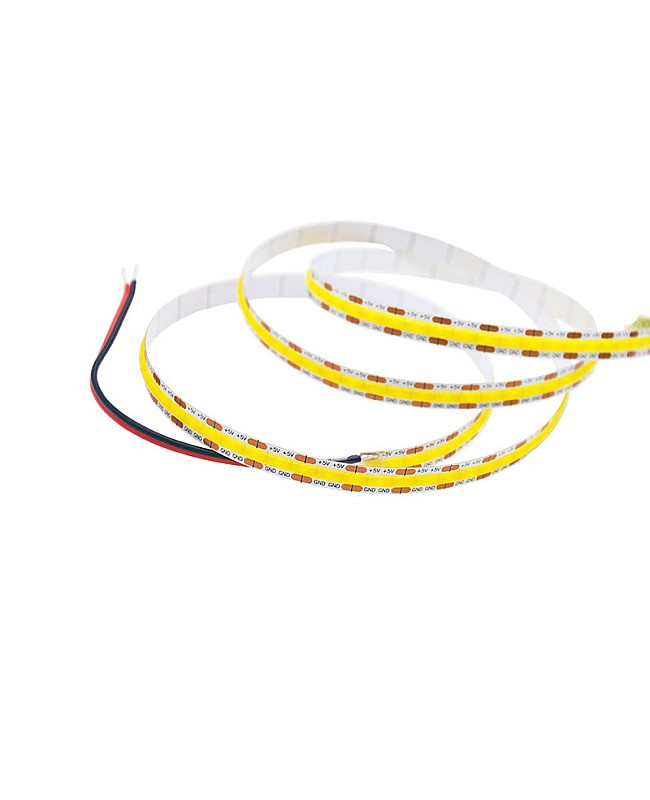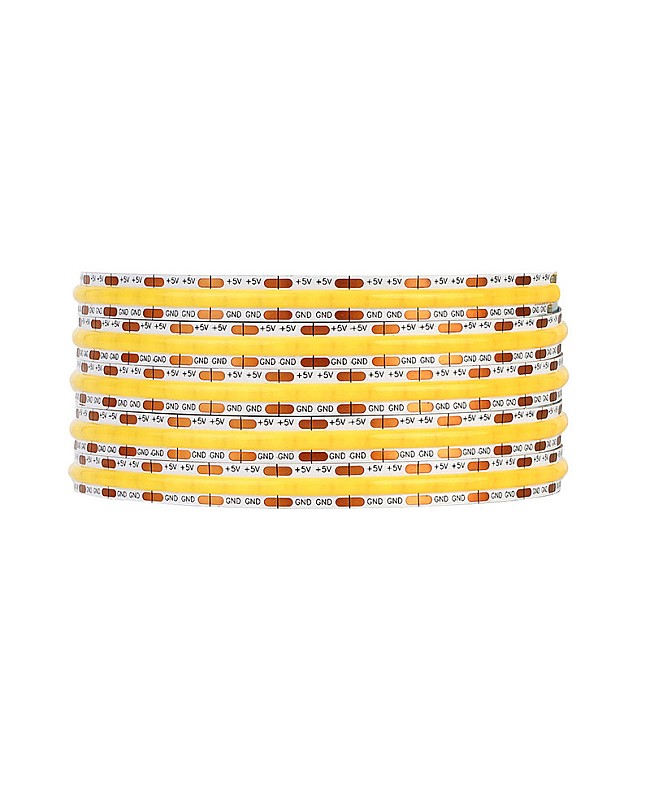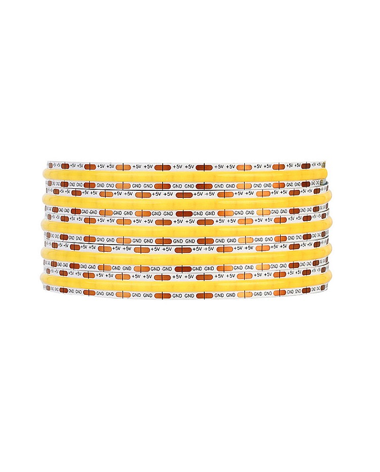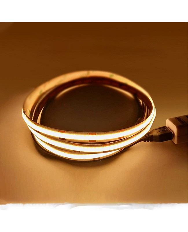The LED strip COB works in DC5V, is easy to light up with a TV or computer USB port, with LED chips on board design, 320PCS LED chips per meter, the high LED density to create a seamless line of light, and no visible light dots and LED hotspots, uniform light emission, high CRI 90+ for quality color rendering. The LED chips are mounted on double-layer FPC gold-plated electrolytic copper wire circuit boards, which are flexible, bendable, and cuttable. The minimum cuttable length is 12.5mm, and the wide beam angle is up to 180°. The back has double-sided adhesive tape, and removing the protective paper and sticking it to the place you want to install is easy. The IP rate is IP20 non-waterproof, only for dry locations and indoor applications. Various emitting colors of products are available, and you can choose warm white, natural white, or cool white for multiple scenes. You can use them in cabinets, bedrooms, living rooms, offices, etc. The COB LED strips have a UL certificate and 3 3-year warranty.
