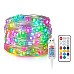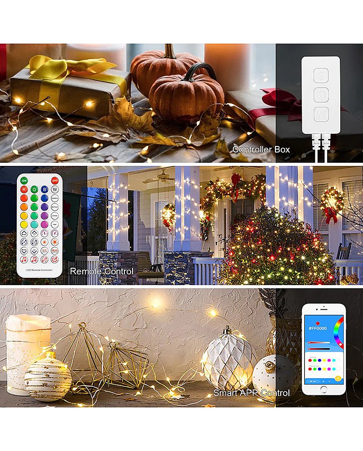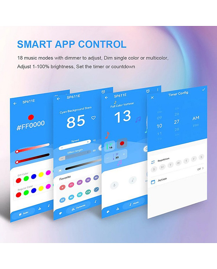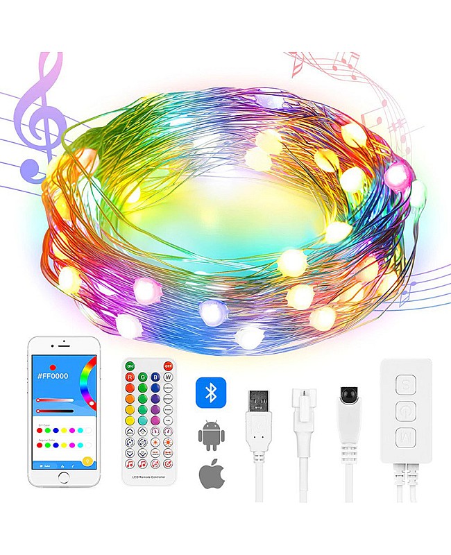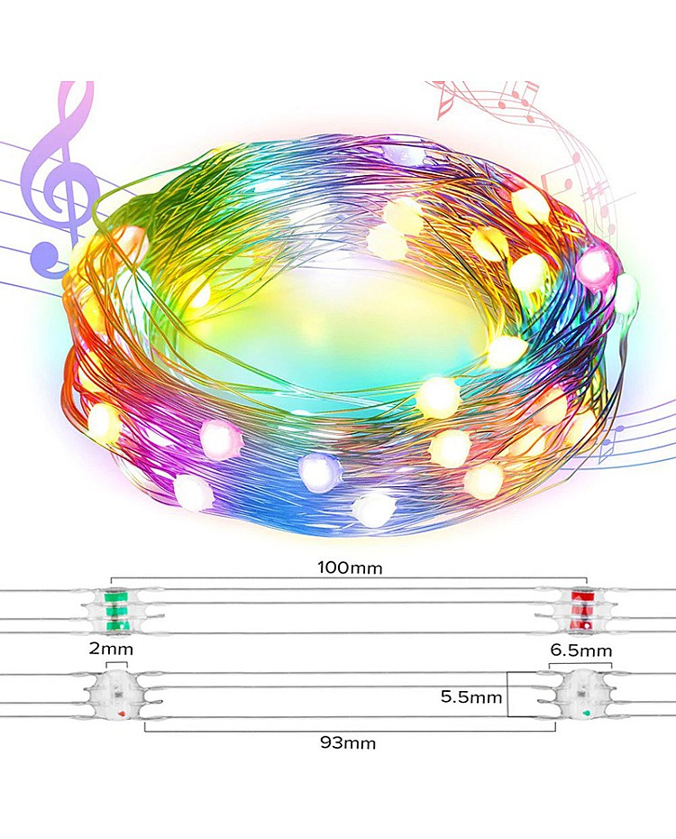 The WS2812B decorative light kit, SP611E controller, and remote control are included and attached with a USB port, which can be lit up by connecting to a power bank, USB socket, USB adapter, or computer. It can be controlled by the physical buttons on the controller, APP control, and remote control to achieve 16 million colors and more than one hundred dynamic modes. The DreamColor light kit has a built-in MIC and 18 music modes available; the light will change automatically following the music rhythm. The brightness is adjustable from 1% to 100% for various scenes. The LED string lights use small LED chips as the light source; you can choose the 5M or 10M length versions. There are 4 colors of wires available: copper, clear, black, and green. The waterproof level is IP65, and you can install them in a damp location for outdoor application, but they can not be put into the water or installed in a rainy place. You can use them for weddings, Christmas, parties, home decorations, etc.