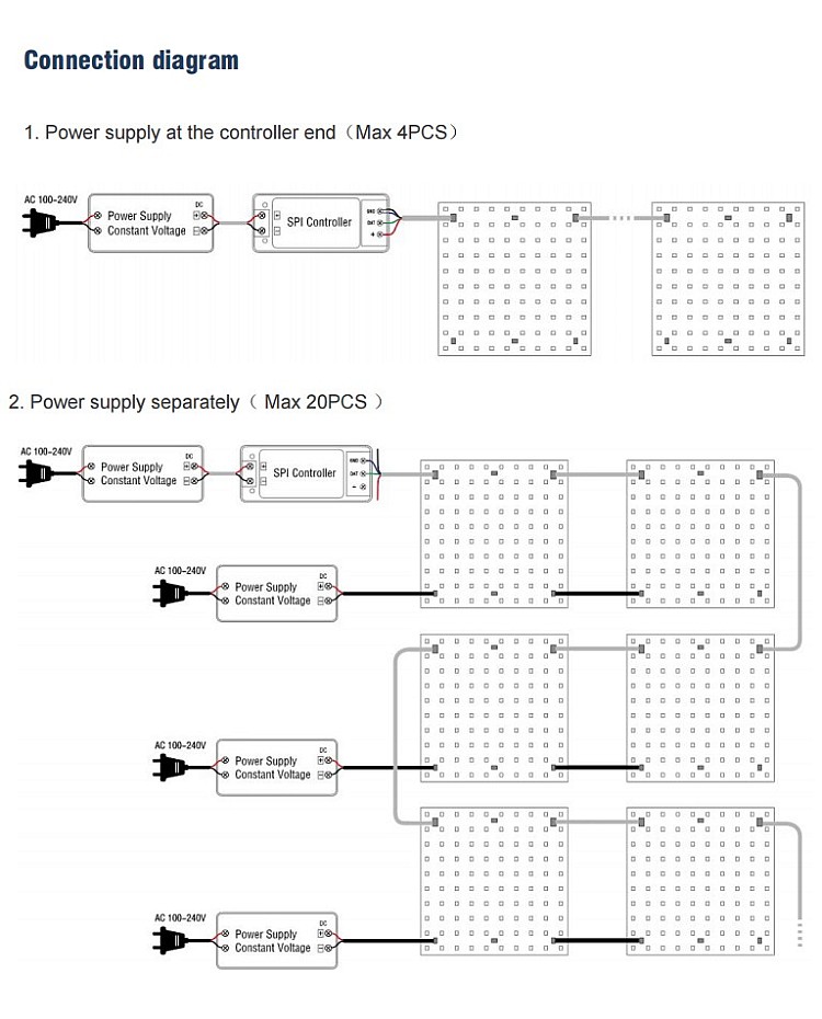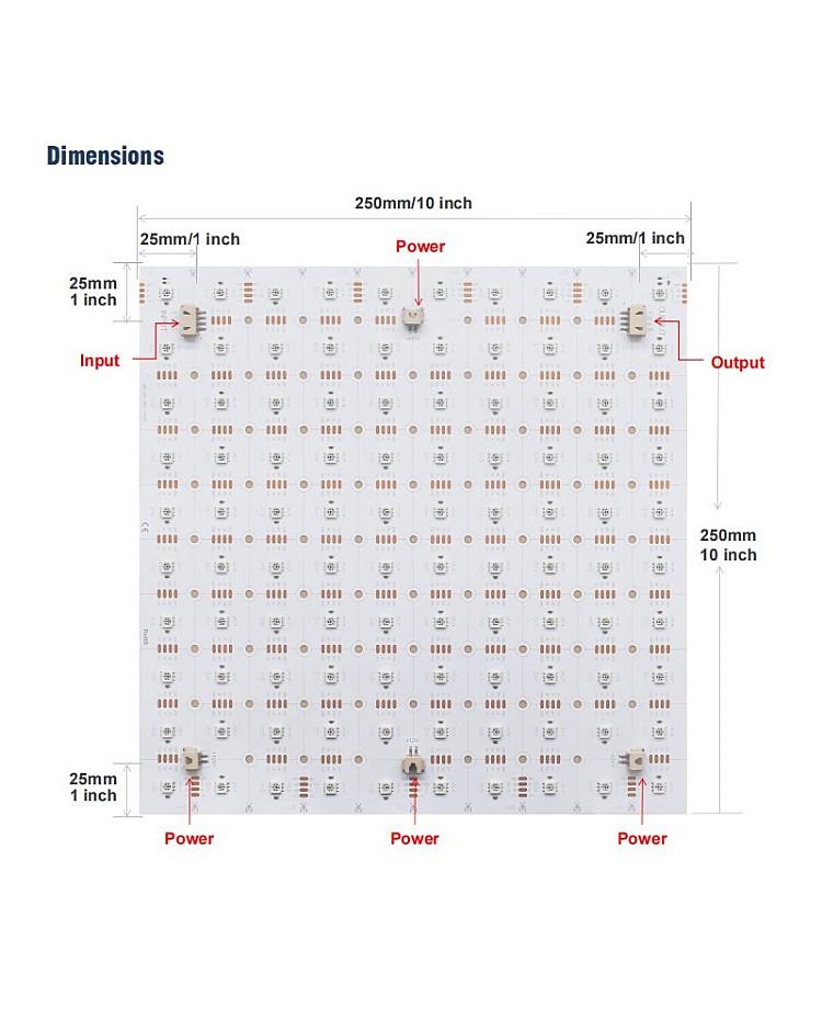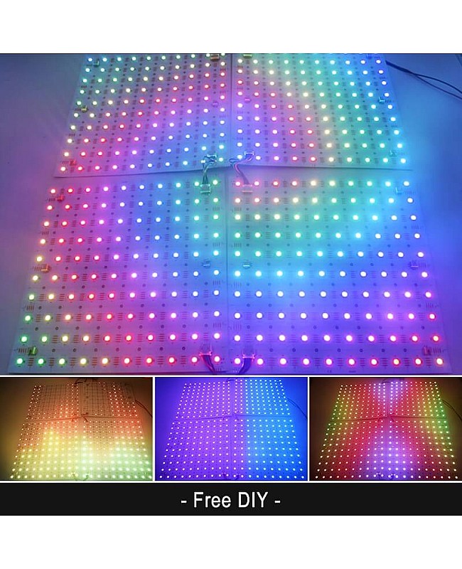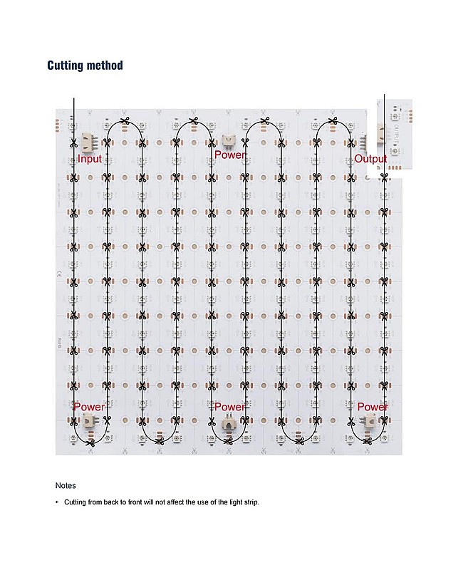 The individual addressable light sheets are the improved solution for backlighting. They have flexible, bendable, cuttable, and connectable features. It can be easily installed or connected as backlighting for marble countertops, display boxes, signs, and DIY projects. 5050 SMDs arranged on square dual-layer PCB boards, along with the LED built-in WS2812 ICs, make them addressable individually, allowing for hundreds of dynamic color changes and patterns. They can be cut to the desired size following the cutting lines and bent to conform to irregular surfaces. They have 6 pieces of connectors (Input, Output, and Power) to connect multiple programmable sheets for large lighting projects. The back has double-sided adhesive tape and screws holes for easy installation. There are IP20 non-waterproof and IP54 waterproof products available.