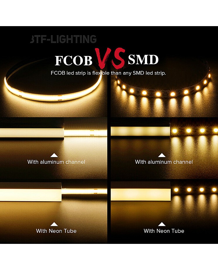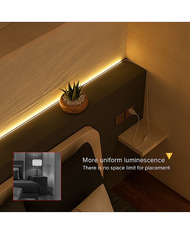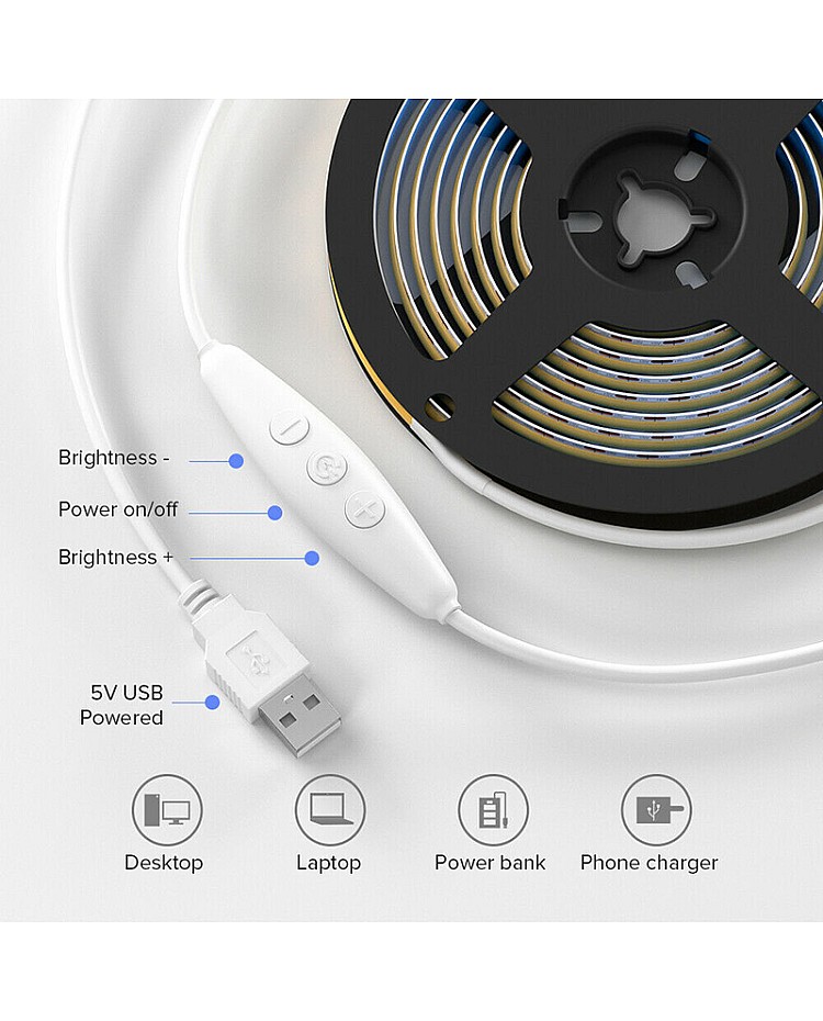 The 5V COB LED strips with USB Controller are easy to connect to the USB port on a PC, laptop, power bank, or wall adapter to light up. There are three buttons on the inline controller, and you can use them to power ON/OFF the LED light and adjust the brightness from 1% to 100%. The COB LED strips use 0922 LED Chips as the light source, with 320 pieces per meter, a high-density LED chip array to produce a seamless linear lighting effect, no hot spot, and no visible light dots, brighter, higher CRI, and uniform light emission. The 5V COB strip lights are more flexible than the SMD LED strips, and you can bend and fold them into any shape for your project. The back has double-sided adhesive tape; you can remove the protector from the tape and stick it freely where you want. The USB COB light strips are non-waterproof and recommended for high-end indoor lighting projects.