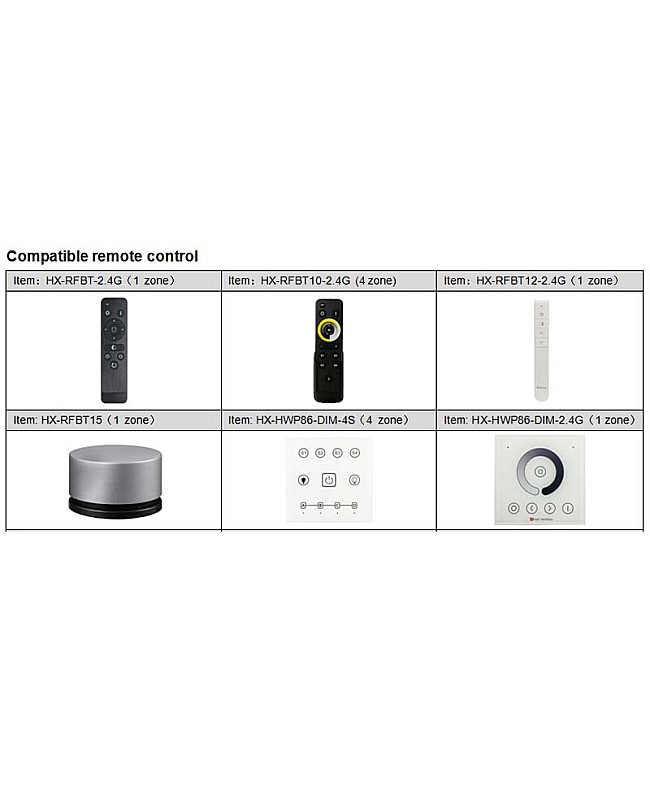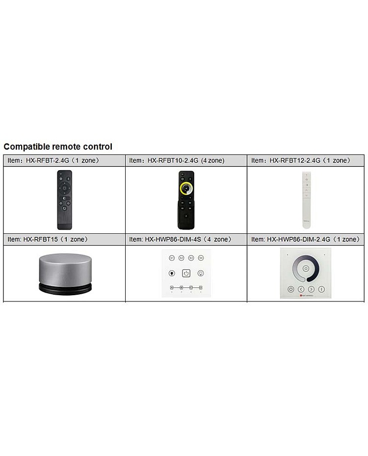 - Compatible With LED Remotes: HX-RFBT-2.4G(1 Zone), HX-RFBT10-2.4G(4 Zones), HX-RFBT12-2.4G(1 Zone), HX-RFBT15( 1 Zone), etc