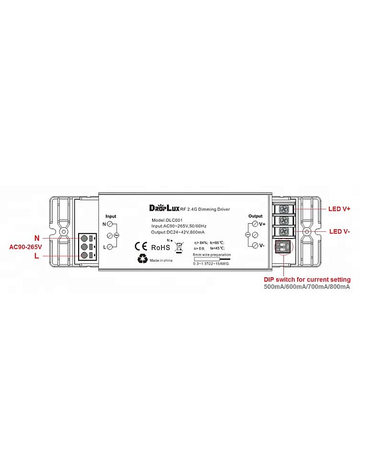 The dimming LED driver constant current, which has an isolated power supply design, is protected from mis-wire, overloading, over-voltage, and short circuits. Adopts the advanced PWM digital control technology for smooth dimming from 3% to 100%. The output current of the constant dimming LED driver is adjustable by pressing the DIP switch, and you can press the DIP switch to set the output current to 500mA, 600mA, 700mA, or 800mA. With the memory function, each time the power is turned on, it retains the mode stopped at the last power-off. The RF LED dimming driver adopts a 2.4G wireless control module with air self-inspection sync control technology, which is compatible with a freelighting control system, realized by phone, Pad, and WiFi smart control system. You can use them for LED panels, ceiling lamps, and downlights in the home, shop, hotel, office, etc.