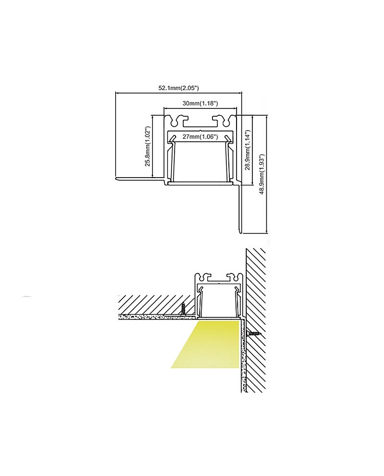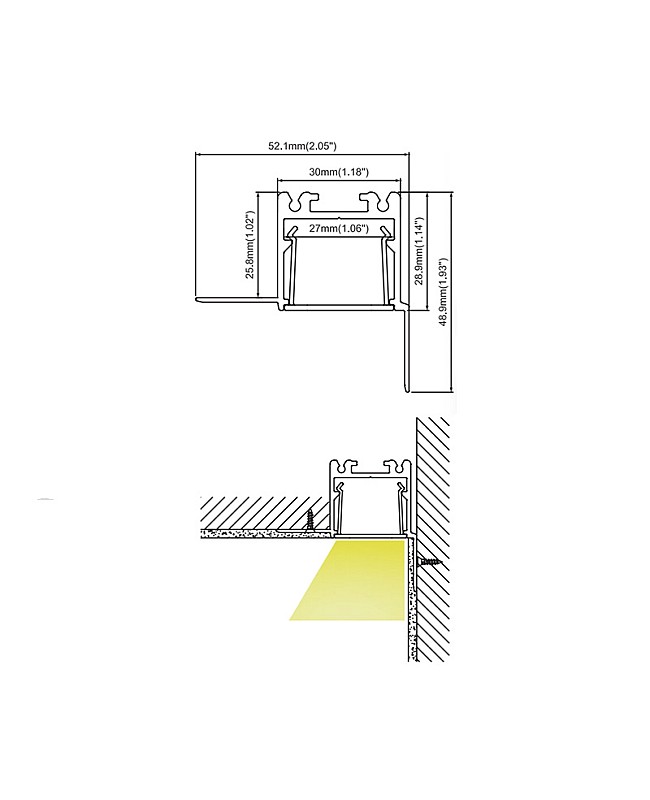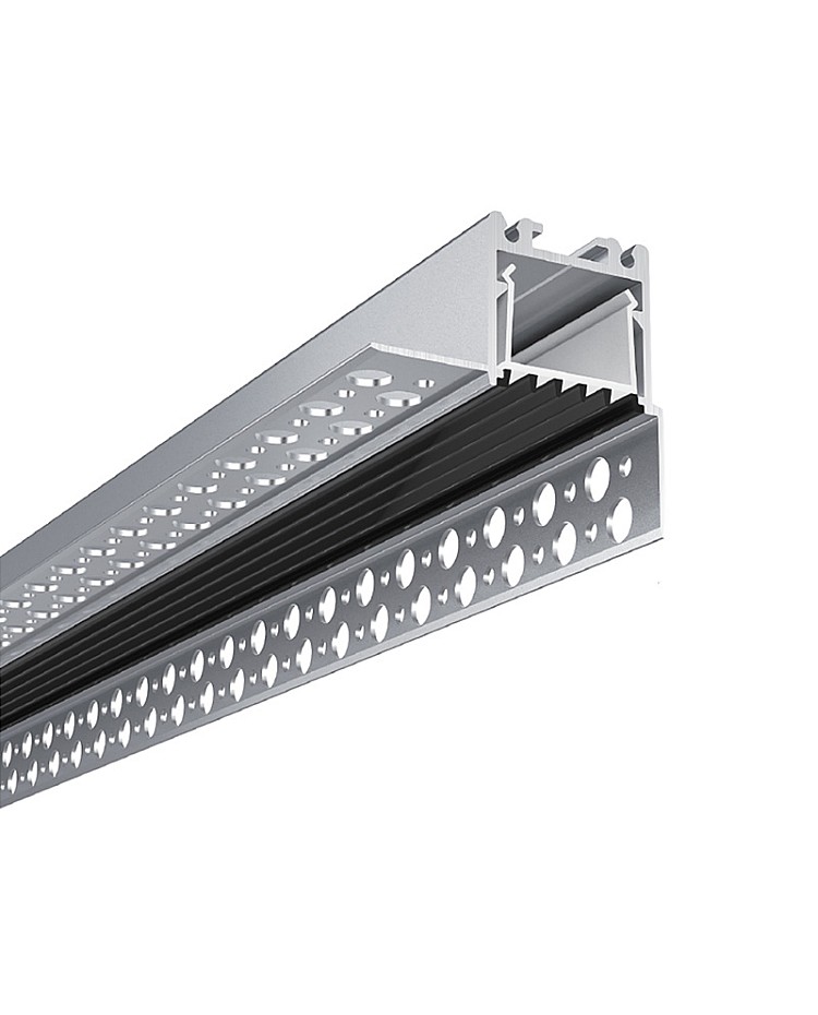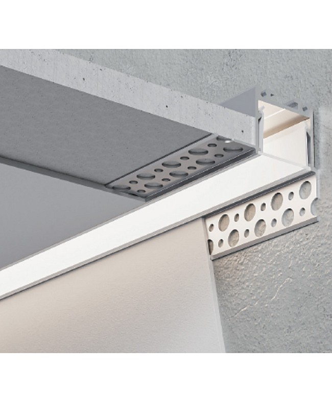 The ALP223 plaster-in LED channels are designed for accent lighting on the perimeter of the drop ceiling sections. They have a regressed cover design. The cover sits slightly back from the edge of the LED channels, creating a subtle shadow gap or indirect lighting effect. These aluminum channels are flush-mounted to plasterboard, creating a clean, minimalist aesthetic while optimizing light diffusion. There are glare-free diffusers available to eliminate hot spots and harsh glare, delivering soft, uniform light. Ideal for residential, commercial, and architectural applications. The inner width is 27 mm, and the maximum strip light width is 26 mm. Recommend adding high-density 24V COB LED strips as the light source to create consistent linear lighting without dark areas and hot spots. The stock length is 2 meters per piece and can be cut to any size for your needs. The ceiling lighting profiles are made of 6063-T5 extruded aluminum alloy, feature a silver anodized finish, and are oxidation-resistant, ensuring long-lasting performance. The LED plaster channels can act as heat sinks to improve heat dissipation. Four types of diffusers are available: PC frosted coves, prismatic covers, and white and black anti-glare covers. The covers are made of high-quality material, are anti-yellowing, and have perfect light distribution. 180° and 90° couplers are sold separately and can be used for angled or straight connections.