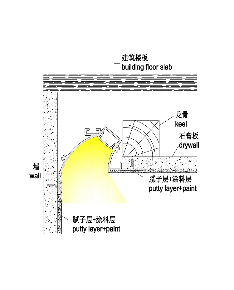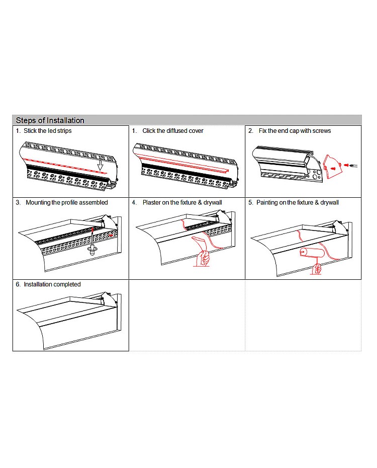 The drywall LED strip diffuser profiles are designed for wall washer lighting. They can be seamlessly integrated into plasterboard ceilings, creating a clean, modern finish. The profiles will hold and conceal the LED strips at an optimal angle, delivering soft, indirect illumination that washes down walls. They are made of high-quality 6063-T5 aluminum with a white powder coating for anti-oxidation and extended lifespan. The stock length is 2 meters, and it can be cut to any desired size. Two types of diffused covers are available: PC diffused and PC semi-clear. They are made of brand material, anti-yellowing, and engineered for even light distribution with reduced glare. The inner width is 15mm and supports flexible LED strips up to 15mm wide. Adding our high-density SMD or COB tape lights without spots is easy. The aluminum base can serve as a heat sink, enhancing heat dissipation. End caps with and without wire holes are included. Three LED profile joiners are sold separately: 90°, 90° vertical, and 180°. You can use them for angled and straight connections. We can also provide inside corner connectors for corner installation.