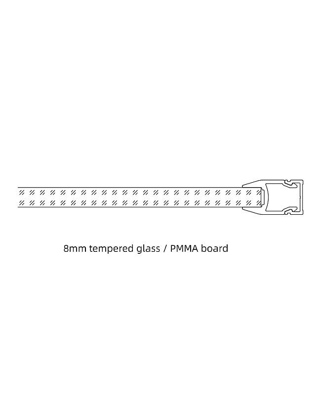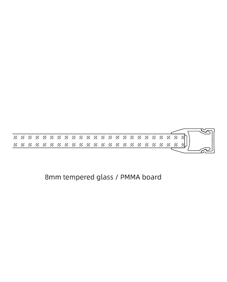 The edge-lit LED channels are designed for glass/acrylic boards; they are easy to mount onto the edge of transparent or frosted panels for a sleek, modern lighting effect. These slim LED profiles offer a clean, secure fit for glass or acrylic panels 6mm or 8mm thick, allowing light to diffuse beautifully through the panel edge and create a glowing, ambient border. Ideal for decorative glass partitions, shelving, signage, and display cases. The edge LED profiles are made of 6063-T5 aluminum alloy with anodized surfaces, providing oxidation resistance and a longer lifespan. The inner width is 11 mm, allowing a maximum width of 11 mm for the LED strips. We recommend using high-density COB tape lights as the light source to create uniform lighting, with no light spots or dark areas. The standard lengths are 1 m and 2 m, and can be cut to any size for your project. There is only one type of diffuser available: the PC diffused cover, made of a brand-stable material that helps diffuse light and protect the LED tapes from dust and dirt. End caps with and without wire holes are included.