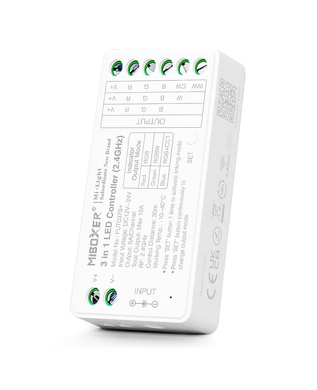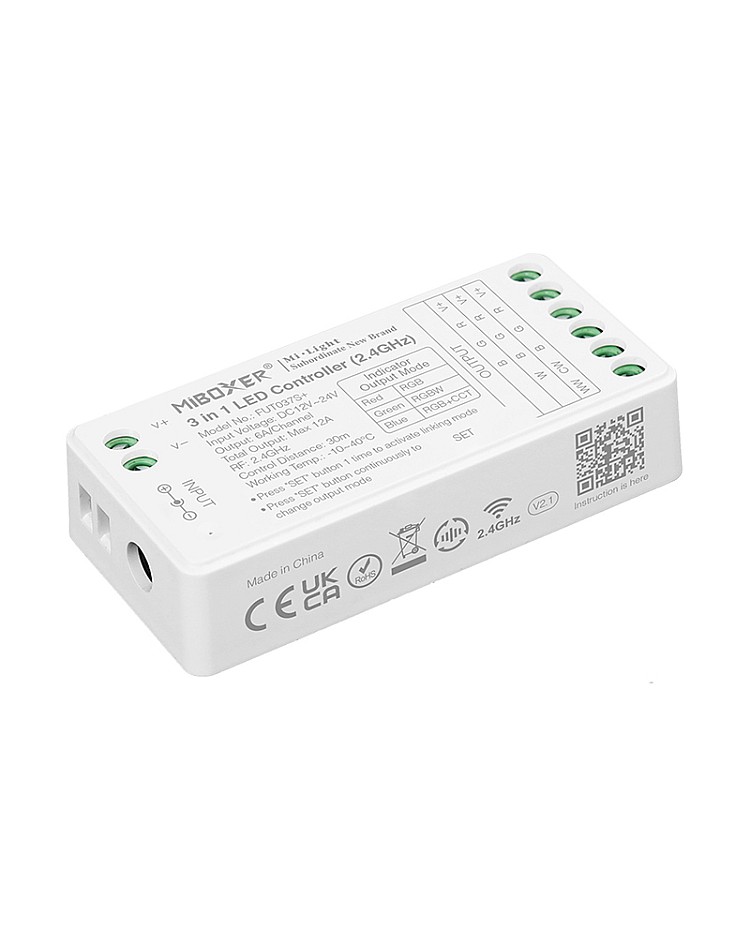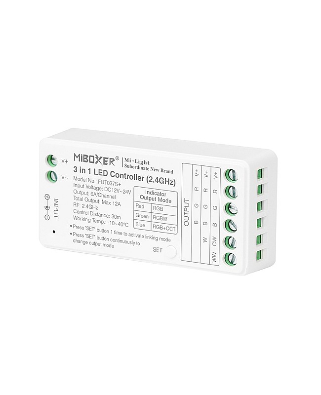 The FUT037S+ Mi Light Controller has 3 in 1 function design for RGB, RGBW, and RGB+CCT LED strips. It integrates 2.4G communication technology and is compatible with Mi-Light and MiBoxer 2.4G series remote control. You can use the remotes to set the color and adjust the color temperature and brightness for various scenes. There are 16M colors to choose from, and the color temperature can be adjusted from 2700K to 6500K, with stepless dimming brightness from 1% to 100%. One button, " SET," is on the controller; you can press it continuously to change the output mode from RGB, RGBW, or RGB+CCT. The Milight controller supports smartphone apps and third-party voice control after being connected to the 2.4 GHz gateways. You can use the APP or voice commands to control the LED lights ON/OFF, set the color, and adjust color temperature and brightness. One FUT037S+ controller will transmit the signals from the remote control to another controller within 30 meters, and different controllers can work synchronously. The light controller has two power interfaces, wiring ports and a DC5.5*2.1 port, and it is easy to connect to a power supply.