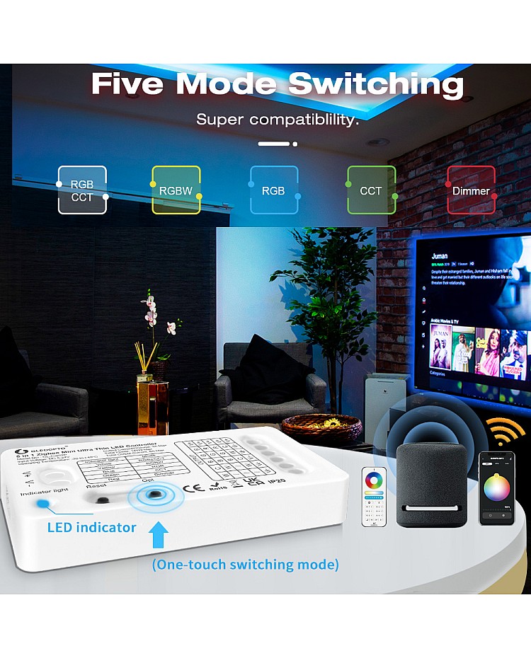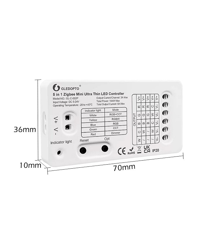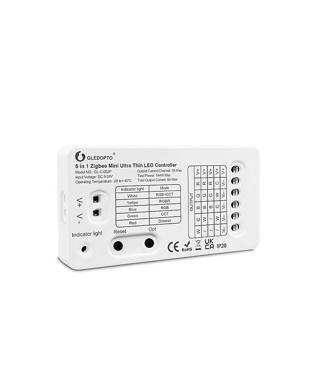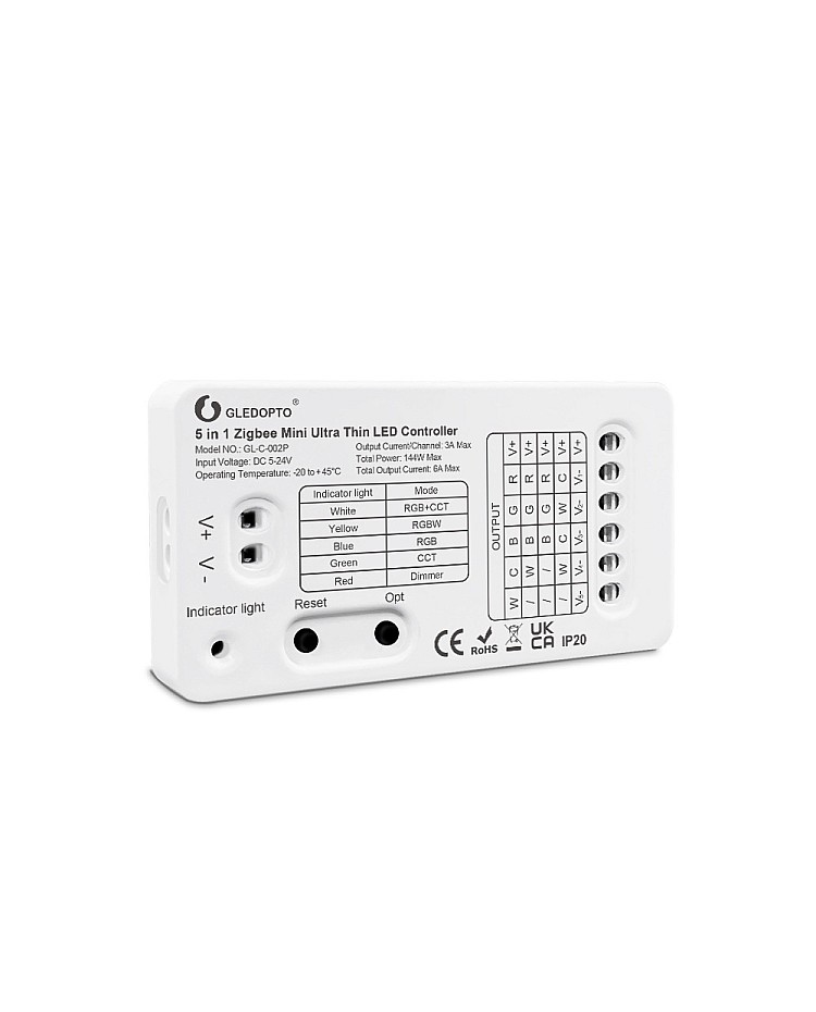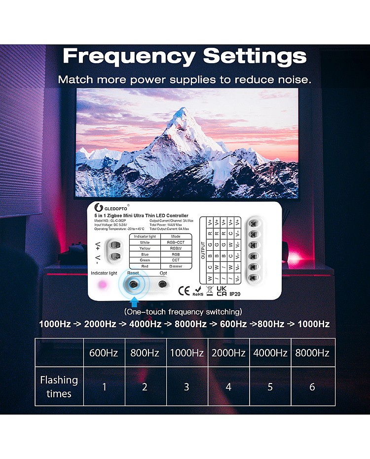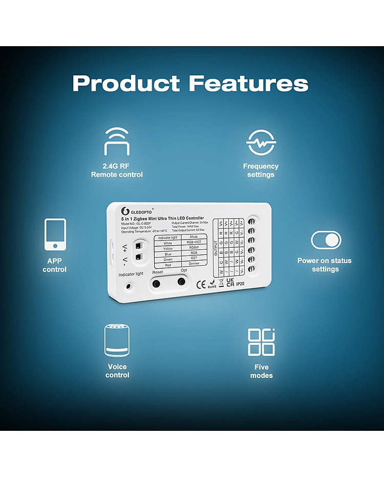 The 5-in-1 mini Zigbee Gledopto controller, with a 5-working-mode switchable design, can be used for RGB+CCT, RGBW, RGB, CCT, and single color LED lights. The Gledopto controller has an ultra-thin size and lightweight design, is smaller than one credit card, and weighs only 23.5 grams. It is easy to install in a small or narrow location. The GL-C-002P works on DC5V to DC24V, with a max output current of 6A and a max loading power of 144W. There are two buttons on the surface. You can press the "Opt" button to switch the working modes; the intuitive LED indicator light will show various colors to indicate the different working modes. There are two power-on modes available, long-press the "opt" button to switch from the mode " remember the status of the ON/OFF before power off" or "lights up by default when powered on".The Zigbee LED controller is compatible with Zigbee 3.0 gateways like Philips HUE, Tuya, Amazon Echo Studio, Smarthings, etc., and can be controlled by a smartphone APP, 2.4G RF remote. You can set the color and adjust the color temperature and brightness. There are 16 million colors available, the color temperature changes from 2200K to 6500K, and brightness is adjustable from 1% to 100%. The Gledopto Zigbee controller can work with Amazon Echo Plus, and you can adjust ON/OFF and brightness through voice commands. The working frequency setting is changeable to match more power supplies to reduce noise. Press the "Reset" button to change the frequency from 600Hz to 8000Hz.