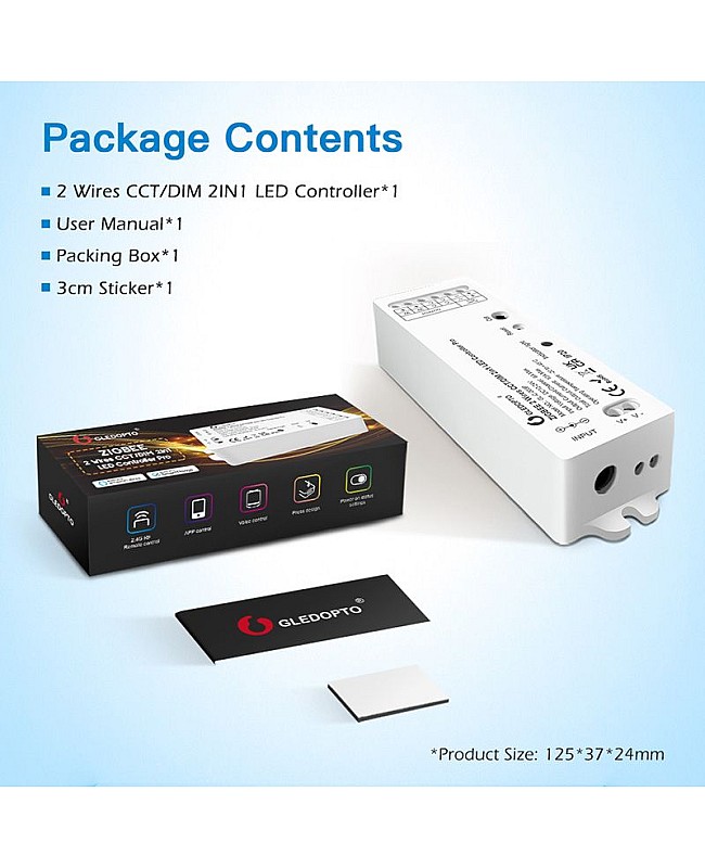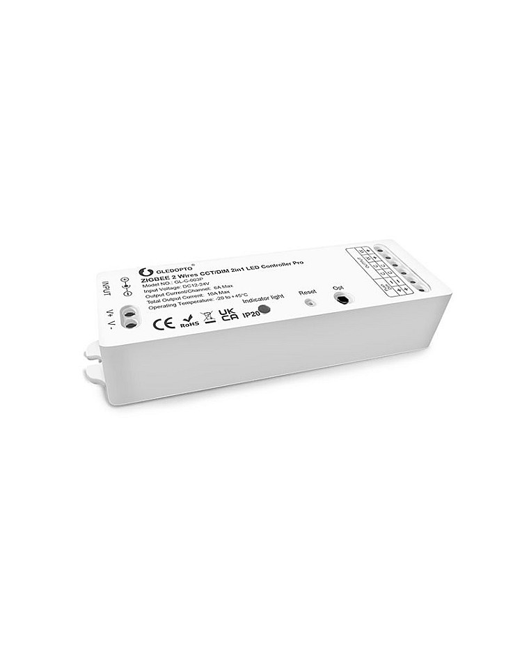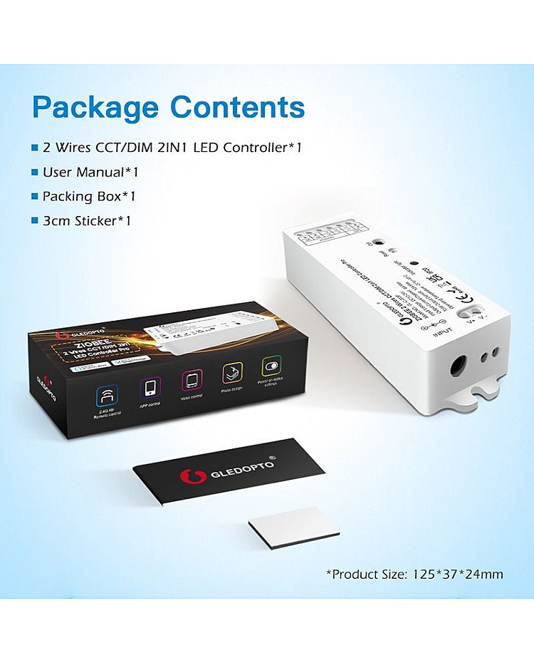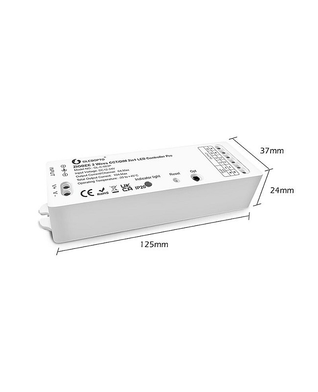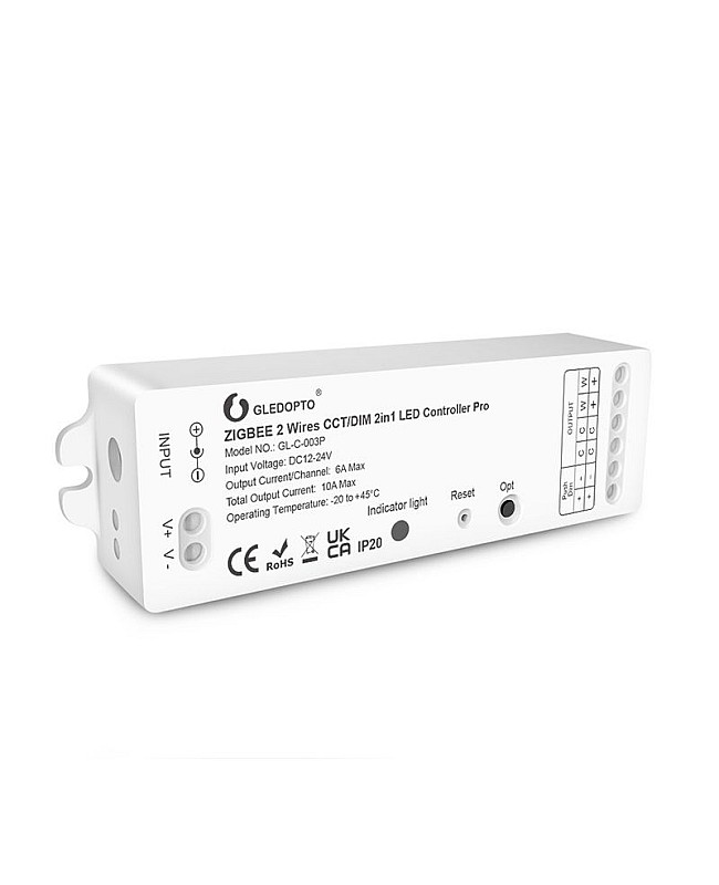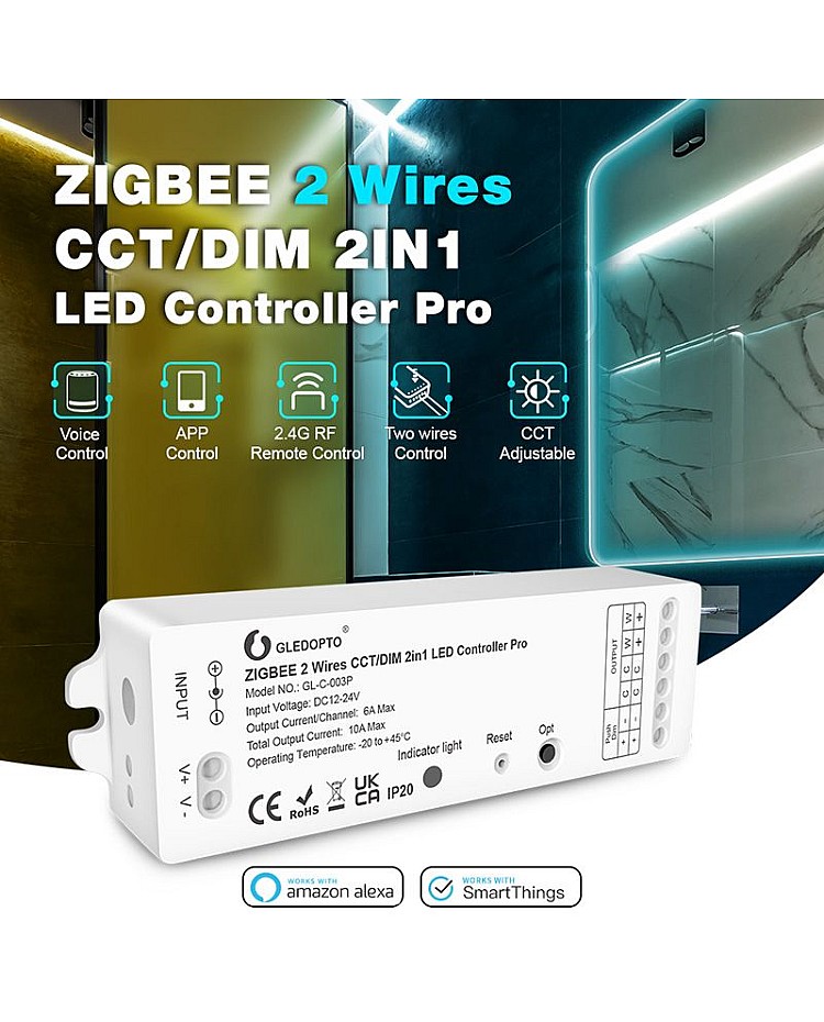 The Gledopto GL-C-003P 2 wires CCT/DIM 2 in 1 Zigbee LED controller is a Zigbee-compatible device designed to control the single color and dual white LED lighting, especially for the 2 wires CCT LED strip lights. The Gledopto controllers are compatible with the common Zigbee 3.0 Gateways, and you can control the lights in all rooms through the phone APP, making your life more convenient. The LED controllers can also be controlled by a 2.4G RF remote, voice, and group control to adjust the brightness from 1% to 100% and the color temperature for various scenes. There is a " Reset " button on the controller; short press once to switch the function; long press for more than 2 seconds to restore the factory setting. The Gledopto Zigbee controller, which has two wires, connects two-wire CCT or dimmer strip lights for easy control. The controller has two input terminals: DC connectors and ports, making connecting to the light driver easy. Connecting the CCT or single-color LED strips with a press-type design output terminal is easy. The Zigbee controllers with external push switches allow them to connect to a push controller to turn ON/OFF and adjust the brightness. It can work with Amazon Echo Plus, which helps to control the LED lights through voice commands.