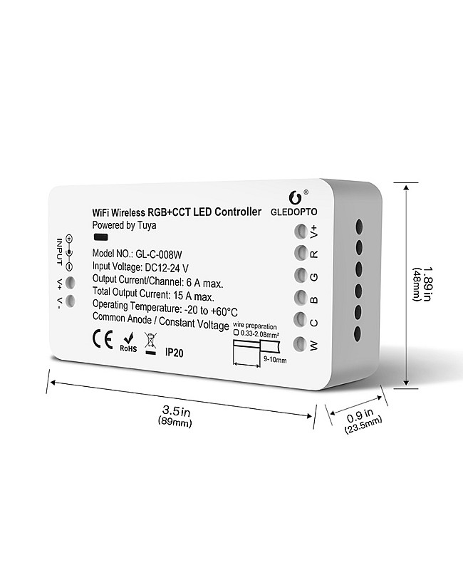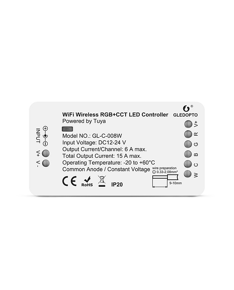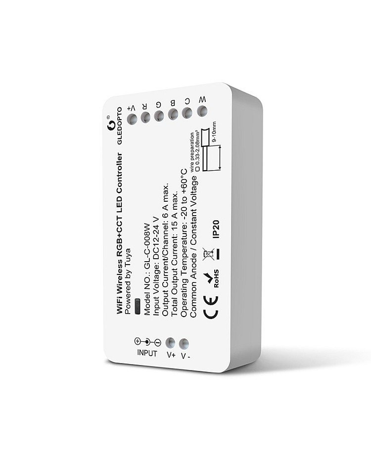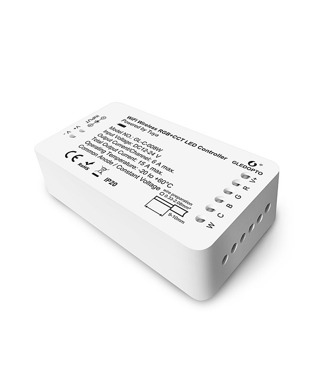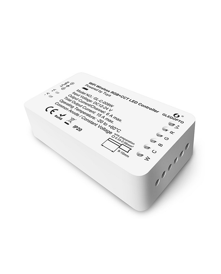 The Gledopto RGB+CCT LED strip WiFi controller can be added to a WiFi network and controlled by the Tuya APP and voice control. No gateway is required; it is easy to connect and use. You can download the Tuya APP from the Apple or the Google Play Store to your smartphone. You can use the APP to set the static color, and adjust the color temperature and brightness. There are 16 million colors available, the color temperature is adjustable from 2000K to 6500K, and brightness is adjustable from 1% to 100% for various scenes. The Gledopto WiFi controller supports most of the smart speakers like Alexa, Google Assistant, DuerOS, Housekeeper, and Tmall Spirit. It will recognize your voice commands and change the lighting automatically. The RGB CCT controller with press-type wiring terminal design is easy to connect to a power supply and LED lights. It's recommended that a controller connect the light strips no more than 10 meters, which is suitable for various indoor lighting applications.